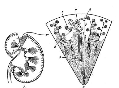 РИС. № 1. Строение почки А - общий вид; Б - увеличенный в несколько раз участок почечной ткани;1 - капсула почечного клубочка;2 - извитой каналец первого порядка;3 - петля нефрона;4 - извитой каналец второго порядка; 5 - собирательная трубка Нефрон является структурно-функциональной единицей почки. У человека общее число нефронов в почке достигает в среднем 1 млн. Нефрон представляет собой длинный канадец, начальный отдел которого в виде двухстенной чаши окружает артериальный капиллярный клубочек, а конечный — впадает в собирательную трубку. В нефроне выделяют следующие отделы: 1) почечное (мальпигиево) тельце состоит из сосудистого клубочка и окружающей его капсулы почечного клубочка (Шумлянского—Боумена).