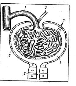 РИС. № 2 Схема строения почечного тельца 1 - приносящий сосуд; 2 - выносящий сосуд 3 - капилляры клубочка; 4 - полость капсулы; 5 - извитой каналец; 6 - капсула; 2) проксимальный сегмент включает извитую (извитой канадец первого порядка) и прямую части (толстый отдел петли нефрона (Геиле); 3) тонкий сегмент петли нефрона; 4) дистальный сегмент, состоящий из прямой (толстый восходящий отдел петли нефрона) и извитой части (извитой канадец второго порядка). Дистальные извитые канальцы открываются в собирательные трубки (рис. 3).