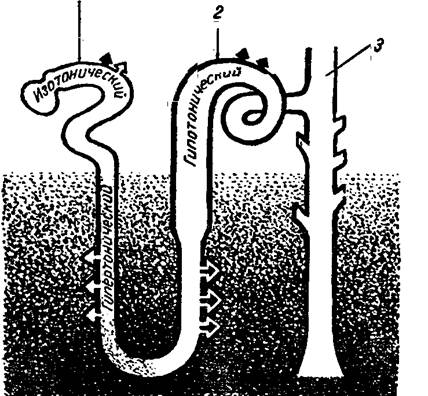 РИС. № 4 Схема работы поворотно - противоточной системы. Затемненный фон показывает величину концентрации мочи и тканевой жидкости. Белые стрелки - выделение воды; черные стрелки - ионов натрия; 1-извитой каналец, переходящий в проксимальный отдел петли; 2 - извитой каналец, выходящий из дистального отдела петли; 3-собирательная трубка Проходя через нисходящий отдел петли нефрона, моча отдает воду, сгущается, становится более концентрированной. Отдача воды происходит пассивно за счет того, что одновременно в восходящем отделе осуществляется активная реабсорбция ионов натрия. Поступая в тканевую жидкость, ионы натрия повышают в ней осмотическое давление и тем самым способствуют притягиванию в тканевую жидкость воды из нисходящего колена. В свою очередь повышение концентрации мочи в петле нефрона за счет обратного всасывания воды облегчает переход ионов натрия из мочи в тканевую жидкость. Таким образом, в петле нефрона происходит обратное всасывание больших количеств воды и ионов натрия. В дистальных извитых канальцах осуществляется дальнейшее всасывание ионов натрия, калия, воды и других веществ. в отличие от проксимальных извитых канальцев и петли нефрона, где реабсорбция ионов натрия и калия не зависит от их концентрации (обязательная реабсорбция), величина обратного всасывания указанных ионов в дистальных канальцах изменчива и зависит от их уровня в крови (факультативная реабсорбция). Следовательно, дистальные отделы извитых канальцев регулируют и поддерживают постоянство концентрации ионов натрия и калия в организме. Канальцевая секреция. Кроме реабсорбции в канальцах осуществляется процесс секреции. При участии специальных ферментных систем происходит активный транспорт некоторых веществ из крови в просвет канальцев. Из продуктов белкового обмена активной секреции подвергаются креатинин, парааминогиппуровая кислота. Этот процесс наиболее выражен при введении в организм чужеродных ему веществ. Таким образом, в почечных канальцах, особенно в их проксимальных сегментах, функционируют системы активного транспорта. В зависимости от состояния организма эти системы могут менять направление активного переноса веществ, т. е. обеспечивают или их секрецию (выделение), или обратное всасывание. Кроме осуществления фильтрации, реабсорбции и секреции клетки почечных канальцев способны синтезировать некоторые вещества из различных органических и неорганических продуктов. Так, в клетках почечных канальцев синтезируется гиппуровая кислота (из бензойной кислоты и гликокола), аммиак (путем дезаминирования- некоторых аминокислот). Синтетическая активность канальцев осуществляется также при участии ферментных систем. Функция собирательных трубок. В собирательных трубках происходит дальнейшее всасывание воды. Это связано с тем, что собирательные трубки проходят через мозговой слой почки, в котором тканевая жидкость имеет высокое осмотическое давление и поэтому притягивает к себе воду. Таким образом, мочеобразование — сложный процесс, в котором наряду с явлениями фильтрации и реабсорбции большую роль играют процессы активной секреции и синтеза. Если процесс фильтрации протекает в основном за счет артериального давления, то есть в конечном итоге за счет функционирования сердечно-сосудистой системы. Процессы 