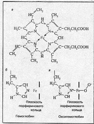 Рис.1. Структура гема (а), структура активного центра дезоксигемоглобина (б), структура активного центра оксигемоглобина (в). перпендикулярно к плоскости порфиринового кольца по обе его стороны. Гемы расположены вблизи поверхности белковой глобулы в специальных карманах, образованных складками полипептидных цепочек глобина. Гемоглобин при нормальном функционировании может находиться в одной из трех форм: феррогемоглобин (обычно называемый дезоксигемоглобином или просто гемоглобином), оксигемоглобин и ферригемоглобин (называемый также метгемоглобином). В феррогемоглобине железо находится в закисной форме Fe(II), одна из двух связей, перпендикулярных к плоскости порфиринового кольца, направлена к атому азота гистидинового остатка, а вторая связь свободна (рис.1, б). Кроме этого гистидинового остатка, называемого проксимальным (соседним), по другую сторону порфиринового кольца и на большем расстоянии от него находится другой гистидиновый остаток — дистальный гистидин, не связанный непосредственно с атомом железа. Взаимодействие молекулярного кислорода со свободным гемом приводит к необратимому окислению атома железа гема [Fe(II) Þ Fе(III); гем Þ гемин]. В дезоксигемоглобине глобин предохраняет железо гема от окисления. Реакция оксигенации Обратимое присоединение кислорода (оксигенация), позволяющее гемоглобину выполнять свою основную функцию переносчика, обеспечивается возможностью образовать прочные пятую и шестую координационные связи и перенести электрон на кислород не от железа (то есть окислить Fe2+), а от имидазольного кольца проксимального гистидина. Это схематически изображено на рис.1, б. Вместо молекулярного кислорода железо гема может присоединить окись углерода СО (угарный газ). Даже небольшие концентрации СО приводят к нарушению кислородпереносящей функции гемоглобина и отравлению угарным газом. Выше было сказано, что одна молекула гемоглобина содержит четыре субъединицы и, следовательно четыре гема, каждый из которых может обратимо присоединить одну молекулу кислорода. Поэтому реакцию оксигенации можно разделить на четыре стадии: Hb+O2 Û HbO2 (1a) НbO2+O2 Û Hb(O2)2 (1б) Hb(O2)2+O2 Û Hb(O2)3 (1в) Hb(O2)3+O2 Û Hb(O2)4 (1г) Прежде чем рассмотреть эту главную функциональную реакцию гемоглобина более детально, необходимо сказать несколько слов о мышечном гемоглобине — миоглобине. Этот красящий белок поперечнополосатых мышц представляет собой комплекс гема с "четвертушкой" глобина. Он содержит одну молекулу гема и одну полипептидную цепочку, состав и структура которой подобны составу и структуре b-субъединицы гемоглобина. Как и для гемоглобина, важнейшей функцией миоглобина является обратимое присоединение молекулярного кислорода. Эту функцию характеризует так называемая кривая оксигенации, связывающая степень насыщения гемоглобина кислородом (в процентах) с парциальным давлением последнего, рО2 (мм Hg). Типичные кривые оксигенации гемоглобина и миоглобина (при условии достижения химического равновесия) приведены на рис.2, а, б. Для миоглобина кривая является гиперболой, как и должно быть в случае одностадийной химической реакции при условии достижения химического равновесия: Mb+O2ÛMbO2 (2) где Mb - миоглобин.