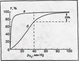 Рис. 2 Кривые оксигенации миоглобина (а) и гемоглобина (б) Совершенно другая картина возникает в случае гемоглобина. Кривая диссоциации имеет S-образную форму. Без кислорода молекулы гемоглобина обладают низким сродством к кислороду и равновесие реакции (1а) сдвинуто влево. Затем кривая становится круче и при высоких значениях рО2 практически сливается с кривой диссоциации миоглобина. [2]