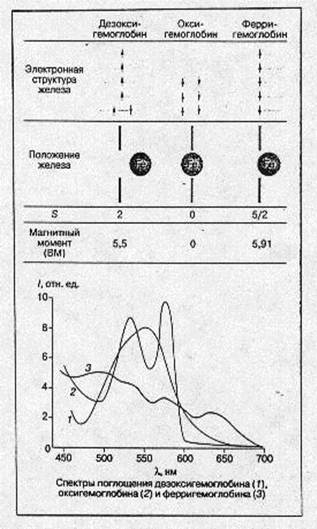 Рис.4. Основные характеристики молекулы гемоглобина в различных состояниях. В ферригемоглобине (метгемоглобин) при нейтральных значениях рН место кислорода занимает молекула воды (при щелочных значениях рН-ОН), железо находится значительно ближе к плоскости гема, чем в дезоксигемоглобине, все пять d-электронов неспарены и занимают пять d-орбиталей. S = 5/2 и магнитный момент равен 5,91 БМ. Структурные изменения в активном центре (вблизи гема) приводят и к значительным изменениям пространственной структуры всего белка. При оксигенации (переход от Т- к R-форме) смещение отдельных аминокислотных остатков достигает 7 А°. Как уже было сказано выше, четвертичная структура гемоглобина характеризуется наличием четырех полипептидных цепей, образующих две (a- и две b-субъединицы). Более детальные исследования показали, что субъединицы образуют ab-димеры. ТÞR – переход сопровождается поворотом одного димера относительно другого на 12-15° и в конечном счете приводит к увеличению карманов, в которых находятся гемы. Эти структурные изменения инициируются присоединением первой молекулы О2 к одному из свободных гемов и распространяются на всю глобулу. Именно поэтому в равновесной смеси всегда присутствуют только Т- и R-формы. Эти димеры в Т-форме стягиваются 14 дополнительными (по сравнению с R-формой) солевыми мостиками (водородные связи между ионными или нейтральными группами аминоксилот, ван-дер-ваальсовы контакты). Кроме того, между b-субъединицами в Т-форме присоединяется молекула дифосфоглицерата, что также приводит к сужению карманов. Эти изменения схематически представлены на рис.5. Триггером для всех описанных выше структурных перестроек при переходах между Т- и R-формами и обратно служит присоединение или отщепление кислорода. После локального элементарного химического акта: присоединение или отщепление низкомолекулярного лиганда, окисление железа при образовании ферригемоглобина (иначе говоря, после появлении лишнего положительного заряда на железе) – возникает существенно неравновесное конформационное состояние – изменения вблизи активного центра уже произошли, а вся огромная молекула белка осталась в прежнем, еще не отрелаксировавшем состоянии. Последующая релаксация может занимать микросекунды и даже секунды. В ходе этой релаксации меняются не только физические, но и химические свойства белка, в частности скорости последующих химических актов, если они успевают произойти до полного завершения релаксации. Таким образом, описанная выше картина процессов, сопровождающих обратимое связывание кислорода гемоглобином, является лишь первым, хотя и очень важным приближением к истине. Так, например, быстрое восстановление железа в ферригемоглобине коротким (микро- или наносекунды) импульсом электронов приводит к возникновению неравновесного состояния, в котором железо уже восстановлено, но не отошло от плоскости порфиринового кольца. По спектральным и магнитным характеристикам это состояние соответствует равновесному оксигемоглобину. Релаксация гема и его ближайшего окружения с удалением железа от плоскости порфиринового кольца занимает при комнатной температуре десятки микросекунд, а полная релаксация всей белковой глобулы к равновесной Т-форме дезоксигемоглобина — сотни миллисекунд.