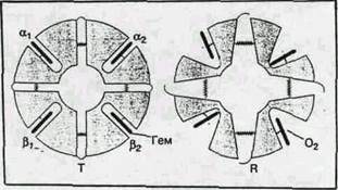Рис. 5. Структурная схема перехода гемоглобина от Т- к R-форме Другие реакции и функции гемоглобина При взаимодействии молекулярного кислорода с гемоглобином существует небольшая, но конечная вероятность окисления последнего: молекула О2 не присоединится, но окислит железо: Fe2+ + O2 Þ Fe3+ O2-. Поэтому при дыхании в эритроцитах непрерывно образуется метгемоглобин. Для его восстановления в эритроците существует специальная ферментативная система, восстанавливающая метгемоглобин и превращающая его в нормальный дезоксигемоглобин. При нарушении этой системы возникает тяжелое заболевание — метгемоглобинемия, при котором гемоглобин перестает быть переносчиком кислорода. Гены, ответственные за синтез гемоглобина, могут подвергаться мутациям, меняющим структуру и функции белка. Наиболее изучена мутация, приводящая к замене только одной аминокислоты в полпептидных цепочках b-субъединиц гемоглобина. Замена глутамина на валин ведет к тяжелой болезни – серповидноклеточной анемии: эритроциты принимают форму серпа и теряют способность переносить кислород. Присоединение кислорода меняет кислотно-основные свойства гемоглобина. Оксигемоглобин является более сильной кислотой, чем дезоксигемоглобин. Поэтому в тканях, где значительная часть гемоглобина теряет кислород и становится более сильным основанием, гемоглобин связывает образующуюся в ходе метаболических внутриклеточных процессов углекислоту. В альвеолах легких дезоксигемоглобин снова превращается в оксигемоглобин, становится более сильной кислотой и способствует отщеплению СО2. Это слегка упрощенное описание важного процесса транспорта углекислоты эритроцитами. Углекислота, освобождаемая тканями, недостаточно хорошо растворима для эффективного переноса. С помощью фермента карбоангидразы, ускоряющего прямую и обратную реакцию СО2+Н2ОÛНСО3-+Н+ (8) двуокись углерода превращается в хорошо растворимый бикарбонат-анион. В капиллярах тканей отщепление кислорода повышает содержание дезоксигемоглобина, связывающего протоны и смещающего, таким образом, равновесие реакции (8) вправо. Легко растворимый ион бикарбоната переносится кровью. В альвеолах легких гемоглобин оксигенируется, протоны освобождаются и равновесие (8) смещается влево. Образуется плохо растворимая двуокись углерода СО2, которая удаляется из водной фазы и выдыхается. Таким образом, гемоглобин работает как буфер с переменным значением pK. Функция гемоглобина как переносчика углекислоты не менее важна, чем его функция переносчика кислорода. Гемоглобин – одно из наиболее хорошо изученных белков. Десятки лет исследований гемоглобина в описании и понимании физических, химических и биологических аспектов его функционирования. Огромный вклад внесли работы Макса Перутца и его сотрудников в Кавендишской лаборатории (Кембридж, Великобритания). Однако важность этих работ касается не только гемоглобина. Они послужили основой развития современных представлений о механизмах ферментативного катализа, связав непосредственно кинетику и термодинамику биохимических реакций с динамикой конформационных изменений макромолекул белка. Если отвлечься от непосредственной практической пользы полученных результатов для медицины, фармакологии, то фундаментальное значение работ по изучению механизма функционирова