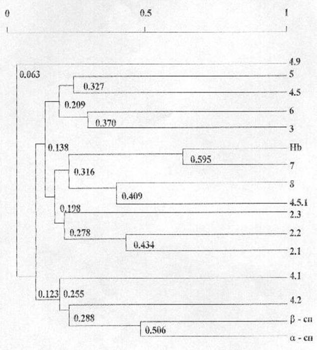 Высокий уровень объединения имел место между количественным содержанием a- и b-спектринов (r=0,506) Самый высокий уровень объединения (r=0,595) соответствовал количественному содержанию гемоглобина и белков полосы 7, основным составляющим белком которой является тропомиозин. ОбсуждениеНа основе полученных данных установлено, что наиболее представительными белками в мембранах эритроцитов человека являются анионтранспортный белок полосы 3, a- и b-спектрины, а также актин. Наименьшее количественное содержание соответствует мембрансвязанному гемоглобину. Несмотря на то, что он содержится в мембране эритроцитов человека в меньшем количестве, гемоглобин играет важную роль как в образовании и поддержании стабильности цитоскелета, так и в механизмах ферментативного катализа и внутриклеточной трансформации энергии. Полученные данные позволили предположить, что в эритроцитарных мембранах рассматриваемые белки во взаимном варьировании их количественного содержания образуют 4 группы взаимнокоррелирующих систем. Причем каждая из этих групп по отношению к остальным характеризуется относительной независимостью. Согласно результатам нашего исследования количественное содержание гемоглобина наиболее тесно связано с содержанием тропомиозина. О причинах этого пока судить трудно вследствие недостаточного количества данных, касающихся этого вопроса - в доступной нам литературе он не получил должного освещения. Но мы надеемся, что полученные данные послужат основой для дальнейшей детализации в изучении связи гемоглобина со структурными белками. Таким образом, полученные нами данные свидетельствуют о сложной структурной и функциональной взаимосвязи белков в мембранах эритроцитов. заключениеЦитоплазматические мембраны эритоцитов человека играют ключевую роль в обеспечении и регуляции физиологической активности этих клеток. Специфические функции мембран обеспечивает сложная структурная организация, главным компонентом которой являются белки. Современные биохимические и биофизические методы позволили выделить практически все основные мембранные белки эритроцитов, изучить их биохимическую структуру и основные аспекты функционирования. Вместе с тем в научной литературе не получил должного освещения вопрос о структуре мембрансвязанного гемоглобина, о его связи со структурными белками. Нами была проведена оценка количественного содержания гемоглобина и основных белков мембран эритроцитов человека, так как нормальное функционирование мембраны определяется не только присутствием белковых компонент, но и их количественным содержанием. Кроме того был предпринят анализ взаимоварьирования количественного содержания гемоглобина и структурных белков. В ходе исследования нами был установлен факт взаимозависимости количественного содержания гемоглобина и тропомиозина. Результаты данного исследования могут служить основой для дальнейшей детализации в изучении связи гемоглобина со структурными белками. Нами планируется провести ряд исследований с целью изучения количественного содержания гемоглобина и его взаимосвязи со структурными белками мембран эритроцитов не только в норме, но и при различных патологических состояниях. С тем, чтобы прогнозировать наряду с уровнем данных нарушений их связь между собой 