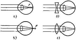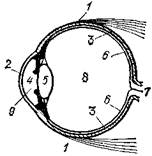 Рисунок 1. Схематический разрез глаза человека. 1 — белковая оболочка, 2 —роговая оболочка, 3 — сосудистая оболочка, 4 — зрачок, 5 — хрусталик, 6 — сетчатая оболочка, 7 — нерв, 8 — стекловидное тело, 9 — передняя камера Промежуток между роговой и радужной оболочками называется передней камерой 9; он заполнен камерной влагой. Внутри глаза, непосредственно за зрачком, расположен хрусталик 5, представляющий собой прозрачное упругое тело, имеющее форму двояковыпуклой линзы. Кривизна поверхностей хрусталика может меняться в результате действия облегающей его со всех сторон мышцы. Посредством изменения кривизны поверхностей хрусталика достигается приведение изображения предметов, лежащих на различных расстояниях, точно на поверхность чувствительного слоя сетчатки; этот процесс называется аккомодацией. Вся полость глаза за хрусталиком заполнена прозрачной студенистой жидкостью, образующей стекловидное тело 8. По своему устройству глаз как оптическая система сходен с фотоаппаратом. Роль объектива выполняет хрусталик совместно с преломляющей средой передней камеры и стекловидного тела. Изображение получается на светочувствительной поверхности сетчатки. Наводка на резкость изображения осуществляется путем аккомодации. Наконец, зрачок играет роль изменяющейся по диаметру диафрагмы. Способность глаза к аккомодации обеспечивает возможность получения на сетчатке резких изображений предметов, находящихся на различных расстояниях. Нормальный глаз в спокойном состоянии, т. е. без какого-либо усилия аккомодации, дает на сетчатке отчетливое изображение удаленных предметов (например, звезд). С помощью мышечного усилия, увеличивающего кривизну хрусталика и, следовательно, уменьшающего его фокусное расстояние, глаз осуществляет наводку на нужное расстояние. Наименьшее расстояние, на котором нормальный глаз может отчетливо видеть предметы, меняется в зависимости от возраста от 10 см (возраст до 20 лет) до 22 см (возраст около 40 лет). В более пожилом возрасте способность глаза к аккомодации еще уменьшается: наименьшее расстояние доходит до 30 см и более — возрастная дальнозоркость. Далеко не у всех людей глаз является нормальным. Нередко задний фокус глаза в спокойном состоянии находится не на самой сетчатке (как у нормального глаза), а с той или другой стороны от нее. Если фокус глаза в спокойном состоянии лежит внутри глаза перед сетчаткой (рис. 2, а), то глаз называется близоруким. Такой глаз не может отчетливо видеть отдаленные предметы, так как напряжение мышц при аккомодации еще сильнее отдаляет фокус от сетчатки. Для исправления близорукости глаза должны быть снабжены очками с рассеивающими линзами (рис. 2, б).