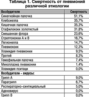 Реферат: Грамотрицательные пневмонииРеферат: Грамотрицательные пневмонииПрофессор Ю.К. Новиков, РГМУ Пневмония – распространенное заболевание органов дыхания, встречающееся у 3–15 человек на 1000 населения. Академик РАМН, профессор А.Г. Чучалин приводит цифру в 1,5 миллиона человек, заболевающих пневмонией в России за год. В США ежегодно заболевают до 4 миллионов человек, из которых в 1 миллионе наблюдений требуется госпитализация. Пациенты старше 65 лет госпитализируются в 3,5 раза чаще, чем в среднем по популяции. Наиболее часто болеют лица моложе 5 и старше 75 лет. Смертность от внебольничных пневмоний составляет 5%, но у пациентов, нуждающихся в госпитализации, она доходит до 21,9%, от нозокомиальных – 20%, у пожилых больных – до 46%. До применения пенициллина смертность от пневмококковой пневмонии с бактериемией составляла 83%. В таблице 1 приведены показатели смертности от пневмоний, вызванных различными возбудителями.
