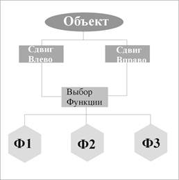 30:RedactF; 40:SearchF; 50:PrintF; 60:b:='e'; End; End; Вывод: Как видно, основную функцию управления взял на себя объект. Благодаря этому действие программы значительно упростилось, программа стала быстрее работать. Схему действия объекта можно изобразить следующим образом Оформление программы. В завершении работы с программой я приступил к оформлению работы. Создание титульной страницы не составило большого труда. Если вы ознакомитесь с программным кодом, то убедитесь, что все команды- из модуля crt. Они используют элементы работы с цветом фона и текста. Procedure oform; Begin TextBackGround(green); {установка цвета фона} clrscr; TextColor(red); {цвет текста} GoToXY(20,10); {перевод курсора в нужную позицию} Write('Редактор Тестов'); {вывод текста} TextColor(darkgray); {цвет текста} GoToXY(20,12); Writeln('автор: Цыбин Антон'); {вывод текста} GoToXY(20,14); Writeln('составлено 09.05.2000'); {вывод текста} TextColor(white); {цвет текста} GoToXY(20,16); Writeln('нажмите клавишу'); {вывод текста} Readln; TextBackGround(black); clrscr; End; Begin Программа рисует титульный лист разноцветными буквами. Основная программа. Реализует действие всей программы, здесь сходятся все процедуры, объекты, функции, но ее действие крайне просто: сначала запускается оформление, затем системное время, а затем управление передается объекту или его методам. По завершении работы программа закрывает все окна и «сворачивает» работу программы. g.x:=10; oform; {оформление} TextColor(green); GoToXY(30,1); Writeln('ТЕСТОВЫЙ РЕДАКТОР. V 1.01.'); {вывод информации} GoToXY(23,2); Writeln('составитель: Цыбин Антон (09.05.2000)'); pannel; repeat Window(60,24,70,24); TextBackGround(black); clrscr; repeat {время} h:=g3; GoToXY(50,22); GetTime(g1,g2,g3,g4); TextColor(yellow); Write(g1,':',g2,' ',g3); Delay(1000); clrscr; until keypressed; b:=readkey; {считывание клавиши} По нажатию клавиши программа определяет дальнейшие действия (передача управления объекту) case b of '1':g.left(b); '3':g.right(b); '0':Begin Window(10,10,53,15); TextBackGround(blue); clrscr; g.choose; End; End; until b='e'; Window(10,10,53,20); {закрытие всех окон} TextBackGround(black); clrscr; Window(10,10,80,15); TextBackGround(black); clrscr; Window(30,10,35,12); TextBackGround(red); clrscr; TextColor(blue); Writeln('конец!'); Readln; End. Программа запускает методы панели управления в соответствии с нажатой клавишей, повторный вызов происходит благодаря циклу.