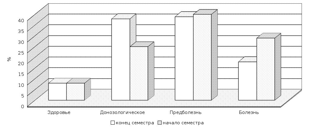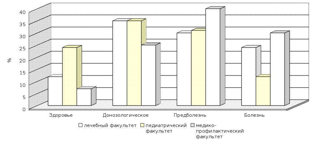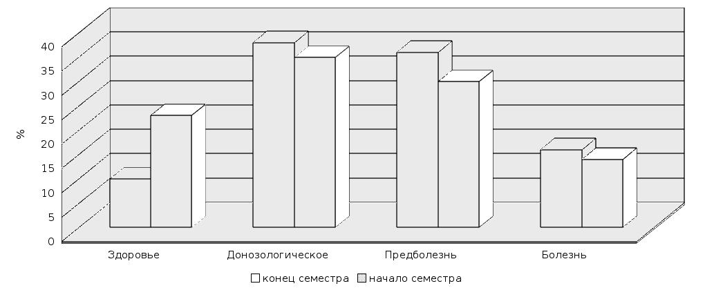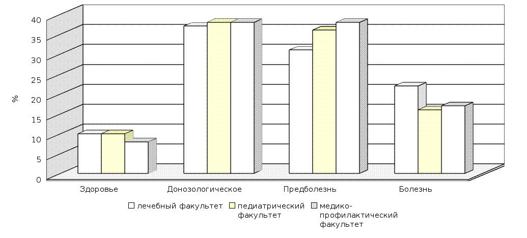 1. На лечебном факультете, как это видно из таблицы №2 и рисунка 1 в конце семестра подавляющее большинство студентов находилось в донозологическом состоянии – 37 %, в состоянии предболезни находился – 31 % студентов, в состоянии болезни – 22 %, здоровья – 10 %. В начале следующего семестра так же подавляющее большинство студентов было в донозологическом состоянии (35 %), предболезнь – 29 % , болезнь – 24 %, здоровье – 12 %. Таким образом видно, что в результате сдачи экзаменационной сессии, которая являлась своеобразным стрессом, увеличилось число студентов в состоянии болезни с 22 до 24 %. С другой же стороны длительный отдых в течение каникул способствовал улучшению адаптационного состояния студентов. Число студентов в состоянии здоровья возросло с 19 до 12 %, снизилось число студентов в состоянии предболезни с 31 до 29 % и в донозологическом состоянии: с 37 до 35 %. На педиатрическом факультете (таблица №3, рисунок 2) в конце семестра большинство студентов тоже были в донозологическом состоянии (38 %), предболезнь – 36 %, болезнь – 16 %, здоровье – 10 %. В начале следующего семестра отмечалось снижение числа студентов по всем состояниям здоровья: донозологическое – 35 %, предболезнь – 30 %, болезнь – 13 %, - за исключением состояния здоровья. Процент студентов, находящихся в этом состоянии возрос с 10 до 23 %. На медико-профилактическом факультете (таблица №4, рисунок 3) в конце семестра преобладающее количество студентов находилось в состоянии предболезни – 39 %, болезни – 17 %, донозологическом – 38 %, здоровья – 7 %. К началу следующего семестра увеличилось число студентов в состоянии предболезни с 39 до 40 % и болезни с 17 до 29 %. В донозологическом состоянии находилось 25 % студентов, а в состоянии здоровья – 7 %.
