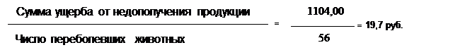 Для данного заболевания характерны следующие виды ущерба: 1.Ущерб от снижения продуктивности животных вследствие их заболевания ( У2). 2.Ущерб от падежа, вынужденного убоя и уничтожения молодняка (У8). У2 = М3 х ( Вз - ВБ ) х Т х Ц, где: М3 - количество заболевших животных; о Вз - среднесуточное количество продукции, полученной от здоровых животных; ВБ - среднесуточное количество продукции, полученной от больных животных ; Т- средняя продолжительность переболевания; Ц - средняя цена реализации единицы продукции, полученной от здоровых животных. У2 = 69 х ( 0,7 - 0,5 ) х 10 х 8 = 1104 руб. У8 = Мн х ( Сп + Вп х Т х Ц ) – Сф , где: Мн - количество павшего, вынужденно убитого и уничтожен- ного молодняка; Сп - условная стоимость одной головы приплода; Вп - среднесуточный прирост живой массы молодняка; Т- возраст павшего, вынужденно убитого и уничтоженного молодняка; Ц- средняя цена реализации единицы продукции, полученной от здоровых животных; Сф - стоимость продукции и сырья, полученного после пере- работки. Сф = 5,61 х Ц , где: 3,61 - количество молока в Ц, которое можно получить за счет кормов, расходуемых на образование одной головы приплода ; Ц- цена реализации 1 ц молока базисной жирности. Сп =3,61 х 550 = 1985,5 руб. У8 = 13х ( 1285,5 + 0,7 х 30 х 8 ) - 100 х 13 = 26695,5 руб. У8общ. = 1104 + 26695,5 = 27799,5 руб. Затраты на проведение ветеринарных мероприятий. Для лечения бронхопневмонии телят в хозяйстве используется препарат Фармазин- 50. В 1999 году стоимость одного флакона ( 50 мл) составила 80 руб. На одного теленка необходимо затратить: 4 мл- суточная доза, курс лечения 5 дней, т.е. на весь курс- 20 мл. Стоимость такого лечения составит: (20 мл х 80 руб.): 50 мл = 32 руб. Всего в 1999 году заболело 69 голов. 32 руб. х 69 гол. = 2208 руб. В качестве средства заместительной терапии применяется препарат Тривитамин. Стоимость 1 флакона - 180 руб. В 1 флаконе содержится 1000 мл препарата. На одного теленка необходимо затратить: 9 мл- на весь курс лечения, т.е. (9 мл х 180 руб. ) : 1000 мл= 1,62 руб. 1,62 х 69 гол. = 111,78 руб. Табл. 15 Затраты на проведение ветеринарных мероприятий.