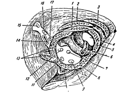 Более точно отношения тарзо-орбитальной фасции к костям рисуются следующим образом. Фасция следует от нижнего орбитального края за передним слезным гребнем вверх, к внутренней связке век, затем переходит через слезную ямку к слезному мешку и прикрепляется к слезной кости позади заднего слезного гребня, за которым она и следует дальше вверх к верхнему краю орбиты; следовательно, тарзо-орбитальная фасция проходит позади верхней, но не нижней половины слезного мешка, или, что то же, — только нижняя половина слезного мешка расположена внутри орбиты, верхняя же находится целиком вне орбиты. К этому надо еще добавить, что надкостница глазницы вокруг слезного мешка расщепляется на два слоя, из которых один следует за носовой (медиальной) стенкой мешка, а другой, известный под названием слезной фасции (fascisa lacrymalis),— за боковой (латеральной) его стенкой. Указанная топографо-анатомическая особенность имеет большое клиническое значение, поскольку, благодаря этому, слезный мешок, лежащий между передним и задним слезным гребешками, оказывается в значительной своей части расположенным впереди septum orbitale, т. е. вне глазницы; поэтому его не без основания называют пресептальным образованием. Клиническое значение этого обстоятельства будет подчеркнуто в дальнейшем при изложении раздела патологии слезоотводящих путей. Здесь уместно только вкратце указать, что те гнойные процессы слезного мешка (дакриоциститы острые и хронические), которые так часто встречаются в клинике, очень редко дают осложнения со стороны глазничных тканей именно потому, что слезный мешок фактически находится вне глазницы; он отделен от ее содержимого сравнительно плотной фасциальной перегородкой, которая является естественным препятствием на пути распространения инфекции кзади, в сторону глазницы. Чтобы исчерпать вопрос о линии прикрепления тарзо-орбитальной фасции, следует еще добавить, что у наружного края костной глазницы фасция переходит несколько на лицевую поверхность скуловой кости, простираясь до шва между этой костью и лобной, вследствие чего здесь между фасцией и поверхностью кости получается карман глубиной до 3—4 мм, куда заходит орбитальный жир. Заканчивая изложение кратких анатомо-топографических сведений, касающихся костной глазницы, следует указать, что стенки глазницы выстланы тонкой, но довольно плотной надкостницей (periorbita), которая сращена прочно с костями лишь по орбитальному краю и в глубине глазницы у зрительного отверстия; на остальном же протяжении это сращение представляется сравнительно рыхлым, и надкостница свободно отслаивается здесь распатором при хирургических операциях и может легко отходить от кости при некоторых патологических процессах (поднадкостничных абсцессах, кровоизлияниях). Надкостница орбиты плотно сращена с тарзо-орбитальной фасцией по линии прикрепления последней к кости. В области крупных глазничных отверстий (fissura orbitalis superior et inferior) надкостница перекидывается через эти отверстия, срастаясь с натянутыми в них соединительнотканными мембранами. Через sulcus infraorbitalis надкостница переходит в виде навеса, превращая таким образом эту борозду в канал. У зрительного отверстия (foramen opticum) надкостница срастается с сухожильным кольцом (annulus tendineus communis Zinni), от которого начинается большинство глазных мышц, и с твердой о
