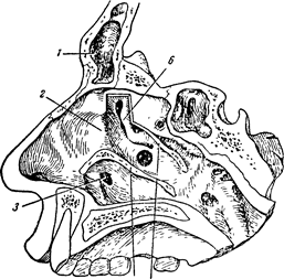 Касаясь отдельных костных стенок (граней) глазницы, надо сказать, что наиболее прочной из них является наружная. Она представлена в передней своей половине скуловой и отчасти лобной костью, a в задней половине— большим крылом основной кости. Наружная стенка глазницы отделяет содержимое глазницы от височной ямки, выполненной главным образом височной мышцей. Практический интерес для клинициста и офталмохирурга наружная стенка глазницы представляет постольку, поскольку в образующих ее костях могут развиваться те или иные патологические процессы, например, туберкулезный остеомиэлит с "излюбленной локализацией" в скуловой кости; из опухолей, в частности, можно указать на гиперостозы большого крыла основной кости; при травмах огнестрельных и неогнестрельных, естественно, может нарушаться целость этой стенки; она служит также объектом хирургических манипуляций при широких вскрытиях глазницы, когда приходится прибегать к временной резекции наружной стенки (костнопластическая орбитотомия Головина-Кронлейна). С патологическими процессами, непосредственно переходящими на наружную стенку глазницы со стороны височной ямки, офталмологу практически не приходится иметь дело. С этой точки зрения наружная стенка глазницы представляется наиболее благополучной по сравнению с другими костными стенками глазницы, которые отделяют содержимое глазницы и, следовательно, само глазное яблоко от придаточных пазух носа. Последние, как известно, нередко являются источником различных патологических, главным образом инфекционных, процессов, которые могут или непосредственно распространяться в глазницу, или во всяком случае вызывать ту или иную реакцию и ту или иную клиническую симптоматику со стороны орбитальных тканей (отек орбитальной клетчатки, флегмону глазницы и (пр.). Верхняя стенка глазницы образована в основном за счет лобной кости, а в самом заднем отделе — за счет малого крыла основной кости. В толще этой верхней стенки, главным образом, в передне-внутренней ее части, заложена лобная пазуха (sinus frontalis). Степень развития этой пазухи индивидуально варьирует; у детей первых двух-трех лет жизни она вообще представляется неразвитой, что следует учитывать при трактовке рентгенограмм детского черепа; у взрослых эта пазуха, занимая передне-внутреннюю часть верхней стенки глазницы, простирается кзади до 1/2 - 2/3 глубины глазницы и в очень редких случаях достигает самых задних ее отделов, т. е. малого крыла основной кости. Верхняя стенка в задних двух третях ее обычно много тоньше, чем в передней трети. Верхняя стенка глазницы с точки зрения клинической патологии представляет большой интерес, поскольку с этой стороны в глазницу могут распространяться различные процессы (воспаления, опухоли), исходящие из лобной пазухи. Кроме того, важным обстоятельством является тот факт, что верхняя стенка отделяет глазницу от передней черепной ямки и, следовательно, от полости черепа и мозга. Практически это имеет огромное значение. Из всех повреждений костной глазницы наиболее серьезными (в смысле общего прогноза) являются те, которые связаны с нарушениями целости именно верхней ее стенки. 0громный опыт Великой Отечественной войны полностью подтверждает это положение. Практический врач-офталмолог должен помнить, что при нарушении целости верхне