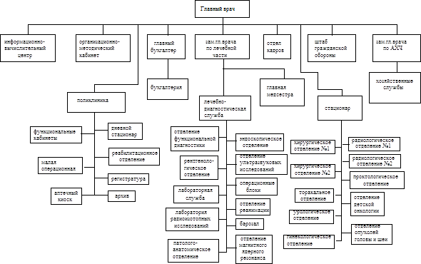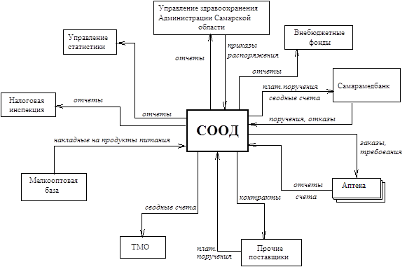 Рис. 1. Схема внешнего документооборота СООД СООД осуществляет организационно-методическое руководство и координацию деятельности онкологических учреждений области (диспансеры, отделения и кабинеты), оказывает организационно-методическую помощь лечебно-профилактическим учреждениям ТМО в вопросах профилактики и выявления злокачественных новообразований, лечения и диспансерного наблюдения за больными, проводит мероприятия по повышению квалификации врачей и среднего медицинского персонала. Главный врач СООД по должности является главным онкологом области и отвечает за организацию онкологической помощи населению Самарской области. Кроме онкологической службы Самары, главный онколог области курирует также Онкологический центр г.Тольятти, онкологическое и радиологическое отделения Сызранской центральной городской больницы, онкологические кабинеты в городах Новокуйбышевске, Чапаевске, Жигулевске и Отрадном. СООД строит свою деятельность на основе договоров с Территориальным медицинским объединением (ТМО) об оказании медицинской помощи населению и договоров с предприятиями и организациями об оказании им медицинских услуг онкологического профиля. Кроме того, СООД заключает хозяйственные договора и трудовые соглашения с организациями , научными учреждениями, учебными заведениями и отдельными специалистами на выполнение исследований и разработок, повышение квалификации кадров, оказание дополнительных медицинских и социальных услуг. Кроме жителей Самарской области услугами СООД могут пользоваться жители других областей России и граждане иностранных государств. Самарский областной онкологический диспансер представляет собой больнично-поликлинический комплекс, включающий в себя поликлинику, стационар на 570 коек, лечебно-диагностическую службу, подчиненную непосредственно зам. главного врача по лечебной части, администрацию и хозяйственные службы. Организационная структура СООД представлена на рис. 2.