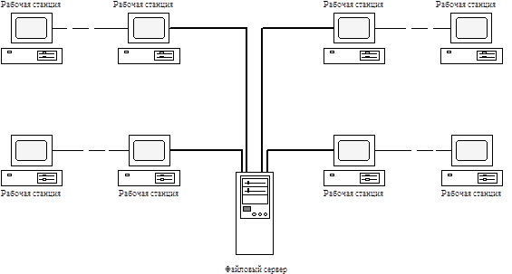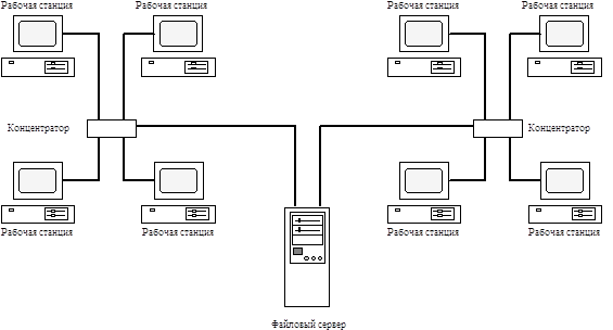 Рис. 10. Пример ЛИВС подразделения с топологией "звезда" Используем для построения ЛИВС топологию типа "шина" (рис. 11). Здесь все рабочие станции разделены на 4 сегмента по 10-15 станций в каждом сегменте. Каждая рабочая станция оснащена одним сетевым адаптером, файловый сервер - четырьмя сетевыми адаптерами. Выбор той или иной топологии диктуется соображениями удобства прокладки сетевого кабеля, необходимостью наращивания ЛИВС и расстоянием между рабочей станцией и файловым сервером (оно не должно превышать 150м). Для постpоения ЛИВС подpазделений пpедполагается использовать стандаpт Fast Ethernet, обеспечивающий скоpость передачи данных 100 Мбит/с.