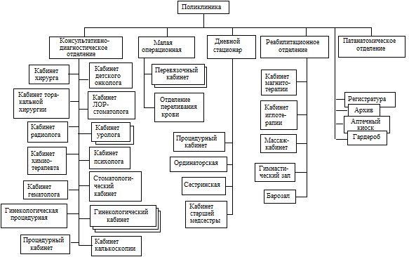 Рис. 2. Структура Самарского областного онкологического диспансера В настоящее время СООД размещается в двух зданиях: корпус №1 на ул. Ленинской, 75 и корпус №2 на ул. Запорожской, 26. Поликлиника и администрация размещаются в корпусе №1, остальные подразделения размещаются, как правило, в обоих корпусах. После завершения строительства нового здания все службы будут находиться в одном месте. В СООД работают 503 работника, из них 97 врачей, 229 человек среднего медицинского персонала, 102 человека младшего медперсонала и 75 работников вспомогательных служб. 2.1. Описание подразделений2.1.1. ПоликлиникаПоликлиника предназначена для первичного обследования и оказания помощи больным амбулаторного профиля, проведения диспансерного наблюде-ния, обследования и периодического лечения хронических больных. Пропускная способность поликлиники составляет около 62000 посещений в год. Организационную структуру поликлиники составляют руководство поликлиники, регистратура, консультативно-диагностическое отделение, реаби-литационное отделение, патолого-анатомическое отделение, дневной стационар на 30 коек, малая операционная, аптечный киоск, архив и гардероб (рис. 3).