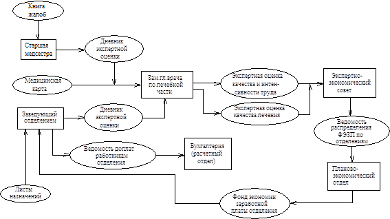 Рис. 5. Схема формирования интегрального показателя работы отделения Старшая медсестра отделения должна составлять требования на медикаменты в аптеку, вести учет расхода медикаментов в отделении, осуществлять связь с другими отделениями стационара и подразделениями СООД, а также осуществлять контроль за работой среднего и младшего медперсонала и вести дневники экспертной оценки их работы. Обязанностью медсестры отделения является выполнение назначений врача согласно листу назначения и проведение процедур, которые фиксируются в журнале учета процедур. Схема документооборота специализированного отделения стационара показана на рис. 6.
