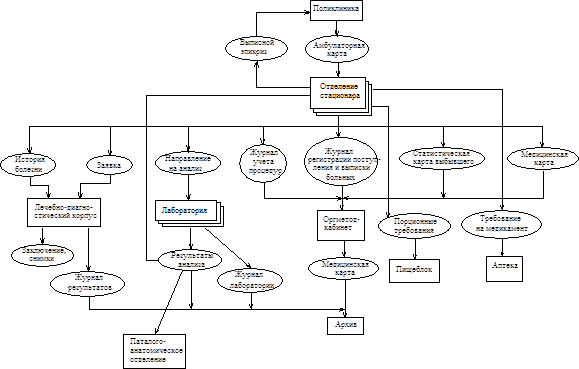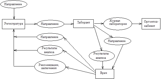 Рис. 6. Схема документооборота специализированного отделения стационара 2.1.3. Лечебно-диагностический корпусЛечебно-диагностический корпус является подразделением СООД и объединяет отделение функциональной диагностики, отделение ультразвуковых исследований, эндоскопическое и рентгенологическое отделения, операционный блок, отделение реанимации, барозал, лаборатории и аптеку. Рассмотрим подробнее состав и назначение основных подразделений лечебно-диагностического корпуса. 2.1.3.1. Отделение функциональной диагностикиОтделение функциональной диагностики состоит из кабинетов функциональной диагностики, которые предназначены для проведения исследований с использованием современных методов диагностики с целью уточнения диагноза и оценки эффективности лечения. Отделение функциональной диагностики включает кабинеты электрокардиографии, фонокардиографии и деографии легких. Пациенты направляются на обследование в кабинеты функциональной диагностики из всех специализированных отделений стационара, которые формируют предварительные заявки на обследование. После проведения обследования заключение передается в отделение лечащему врачу и подклеивается к медицинской карте. Результаты обследования заносятся в журналы, которые хранятся в кабинете. Аналогично осуществляется взаимодействие палатных отделений стационара с рентгенотделением, которое состоит из кабинетов общей диагностики, инвазивной диагностики и маммографии. 2.1.3.2. Лабораторная службаЛабораторная служба СООД - это специализированное подразделение, предназначенное для проведения лабораторных исследований биоматериалов, которые поступают из всех отделений стационара. Лабораторная служба включает в себя клиническую, биохимическую, гематологическую, бактериологическую, иммунологическую, гистохимическую, гистологическую и цитологическую лаборатории, а также лабораторию радионуклидной диагностики. Биоматериал поступает в лабораторию с направлением, где указаны ФИО пациента, у которого он взят, отделение и ряд служебных параметров. Поступившие биоматериалы регистрируются в журнале регистрации и разносятся вместе с направлениями по лабораториям. В лаборатории просматриваются данные о пациенте и перечень проводимых методик записывается в журнал лаборатории. Каждый лаборант формирует для себя из журнала программу на день по выполняемому им перечню методик. По выполнении методики результаты заносятся в журнал лаборатории и в направление, которое передается врачу-диагносту. Врач лаборатории по результатам анализов формирует заключение и рекомендации. При необходимости он может назначить повторное или дополнительное исследование. По окончании этой работы направления с результатами, заключениями и рекомендациями передаются в регистратуру, а затем разносятся по отделениям. На основании журналов лабораторий ежемесячно формируются отчеты о проведенных исследованиях. Схема документооборота лаборатории приведена на рис. 7.