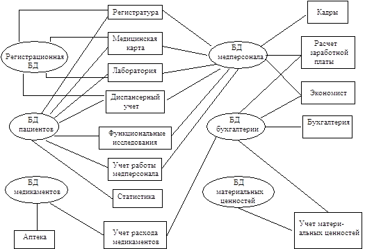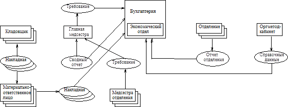 Рис. 8. Схема бухгалтерского документооборота 2.2. Особенности и недостатки в организации работы СООДСООД - это сложная организационная структура, все подразделения которой работают в тесном контакте друг с другом для обеспечения взаимосвязи и приемственности в лечении больных. СООД охватывает своим обслуживанием практически все население Самарской области (свыше 3,2 млн человек). Нагрузка на подразделения СООД по статистике составляет : - поликлиника - 62000 посещений в год; - стационар - 8500 человек в год; В подразделениях СООД собирается и обрабатывается большой объем информации о поступлении, лечении и движении больных в стационаре и поликлинике. Большая часть этой информации обрабатывается сотрудниками ОМК и ИВЦ. В подразделениях СООД и между ними циркулирует большой поток медицинской документации, часть которой неоднократно дублирует по содержанию друг друга. По статистике суточный документооборот в СООД составляет более 10 тысяч документострок. Результаты предпроектного обследования СООД позволили выявить следующие недостатки существующей системы управления: - необходимость ведения дополнительных журналов регистрации и учета больных по всем службам СООД, что приводит к дополнительным неоправданным затратам рабочего времени медперсонала; - отсутствие оперативной связи между службами СООД вызывает необходи-мость заполнения и передачи множества учетных и промежуточных форм, дублирующих основную информацию (статистический талон, направление, контрольная карта диспансерного наблюдения, статистическая карта выбывшего из стационара и т. п.), что приводит к частичной потере информации, непроизводительным затратам рабочего времени, необходимости содержать дополнительный штат работников; - отсутствие возможности получения оперативной информации о больном приводит к увеличению сроков обследования больного, к дублированию обследований, задержке в назначении соответствующего лечения, в результате чего увеличивается время пребывания на больничном или в стационаре; - отсутствие оперативности в получении информации по группам больных, по нозологическим единицам, по проведенным обследованиям и т.д. приводит к искажению информации на момент ее получения; - трудоемкость в обработке информации, полученной в результате обследования больного, ведет к неоперативному получению ее лечащим врачем, снижению пропускной способности кабинета, невозможности введения новых методов обследования; - отсутствие необходимой оперативной информации в связи с громоздкостью ее сбора и систематизации не позволяет делать оперативный углубленный анализ деятельности для разработки мероприятий по улучшению работы; - трудность доступа к информации, необходимой для установки дифференциального диагноза, приводит к необоснованному привлечению к консультации чрезмерного количества узких специалистов, назначению ненужных методов обследования; - значительная часть рабочего времени медперсонала тратится на оформление документов, что сокращает время непосредственного контакта с больным, время диагностического обследования, ухудшает качество работы врача; - существующая система передачи информации на бумажных носителях из одного подразделения в другое приводит к потерям рабочего времени и увеличивает вероятность потери информаци
