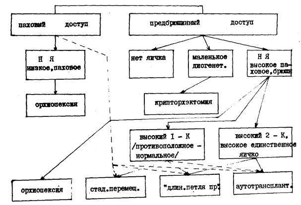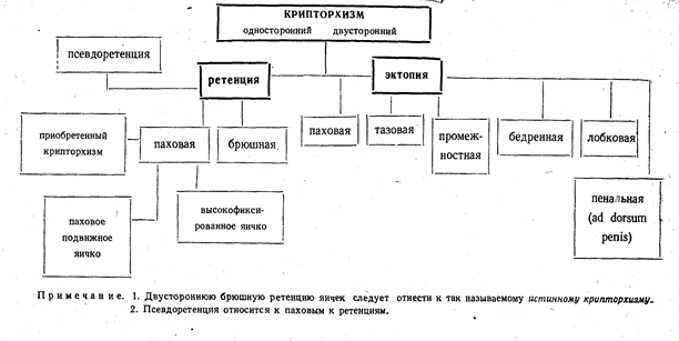 Реферат: Крипторхизм и его хирургическое лечениеРеферат: Крипторхизм и его хирургическое лечениеПлан реферата 1) Общие сведения о крипторхизме 2) Этиология и формальный генез 3) Классификация крипторхизма 4) Клиника крипторхизма 5) Диагностика крипторхизма 6) Хирургическое лечение крипторхизма 7) Ближайшие и отдаленные результаты хирургического лечения крипторхизма 8) Место гормонотерапии в хирургическом лечении крипторхизма 9) Заключение. Общие сведения о крипторхизме. Клинически термин «крипторхизм» (kryptos-скрытое, orchis-яичко) является синонимом термина «неопустившиеся яички», который в свою очередь определяет то, что яички при внутриутробном развитии плода не спустились до своего нормального положения на дне мошонки. Такое определение делает термин «крипторхизм» собирательным, обобщающим все те аномалии положения яичка, когда оно не достигает дна мошонка Taким oбpазом, в пoнятиe «крипторхизм» входят различные виды эктопии яичек, незавершенное опускание (когда яичко расположенно высоко в мошонке). Аномалия бывает односторонней (kryptorhismus unilateralis) и двусторонней (kryptorchismus bilateralis). Крипторхизм, как и паховые и особенно врожденные грыжи, бывает чаще справа. Крипторхизм не относится к числу редких хирургических заболеваний. У взрослых аномалия положения яичек наблюдается в 0,3% случаев, а у детей и подростков — в несколько раз чаще, составляя к периоду полового созревания 2—3%.О нарушениях процесса опускания яичек было уже известно давно. Hunter упоминает, что знаменитый завоеватель Тамерлан (1336—1406) страдал этим недугом. В XVI веке в каноническом указе папы Сикста 5 было запрещено вступление в брак мужчинам, у которых в мошонке отсутствовали яички. В конце прошлого столетия и в первые десятилетия Х века вопросами аномалии положения яичек и устранением этой далеко не безобидной патологии занимались видные хирурги и урологи, руководители крупных клиник (Helferich, Witzel, Kocher, Ombredanne, Б. Н. Хольцов, П. А. Герцен, И. И. Греков, Р. М. Фронштейн, Goebell, Riedel, Bauer и др.). В последние годы в связи с возросшим вниманием к оздоровлению молодого поколения, развитием детской хирургии, а также стремлением к разрешению вопроса о профилактике мужского бесплодия вновь появилось много работ, посвященных проблеме крипторхизма, в том числе ряд монографий и диссертации. Этиология и формальный генезВ процессе роста и развития мужские половые железы претерпевают в эмбриогенезе значительные изменения в своем положении: они опускаются от места первичной закладки в поясничной области через переднюю брюшную стенку в мошонку. Этот сложный и длинный путь опускания является основной предпосылкой возникновения аномалий положения яичка. На одном из этапов своего нормального пути от нижнего полюса почки до входа в мошонку яичко может задержаться. Это состояние обозначается как незавершенное опускание или задержка яичка (retentio testis). Различают две основные формы задержки яичка: брюшную, когда яичко остается в пределах брюшной полости (retentio testis abdominalis), и паховую, когда яичко задерживается в паховом канале или у его поверхностного кольца (retentio testis inguinalis). Наряду с задержкой яичка встречается и другая, более редкая аномалия его положения, связанная с неправильно закончившимся процессом опускания. При этой аномалии яичко уклоняется от нормального пути и по выходе из поверхностного 