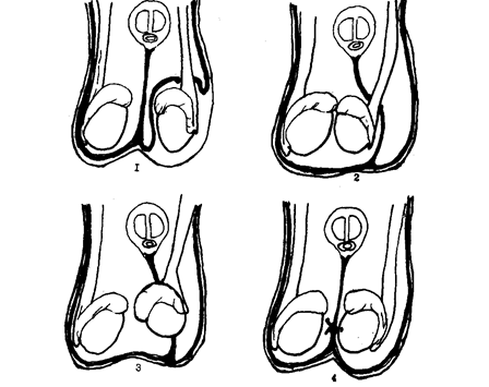 Под истинным крипторхизмом обычно подразумевают абдоминальную задержку гипоплазированных яичек. Гипоплазия может быть результатом герминативного порока развития — первичная или гормонально обусловленная -вторичная. Истиный крипторхизм, как правило, бывает двусторонним и имеет своим фоном более или менее выраженную картину общей эндокринопатии. Это наиболее сложная форма крипторхизма, представляющая значительныё трудности в распознавании и лечении. Ретрагированное яичко, свободно подвижное (псевдоретенция, или ложный крипторхизм), расположёно в паху и может быть перемещено исследующей рукой путем легкой тракции до корня мошонки, а затем снова ускользнуть в паховый канал. В практическом отношений целесообразно выделить приобретенный крипторхизм, который может явиться следствием травмы, неудачного оперативного вмешательства, ношения бандажа. Ретроперитонеально расположенные яички—абдоминальные ретенции и тазовые эктопии — можно по праву отнести к так называемому истинному крипторхизму: яички действительно «надежно спрятаны» и клиническим методам обнаружения недоступны. Уточнение диагноза здесь возможно в большинстве случаев лишь при лапаротомии. Среди эктопий следует выделить паховую эктопию, на которую приходится 1/3 всех случаев пахового крипторхизма. Парадоксальная эктопия (ectopia transversa paradoxa), при которой оба яичка расположены в одной половине мошонки и опускаются через один паховый канал, встречается редко и не отражается на состоянии и функции яичек. Случаи ectopia transversa paradoxa не следует относить к крипторхизму, поскольку оба яичка ходятся в мошонке. Клиника крипторхизма1. Боли У 60-70% всех больных крипторхизмом наблюдаются тянущие боли в паховой области или чувство неловкости. Это постояные , нерезкие со своеобразной эмоциональной окраской болевые ощущения. При паховой эктопии яичка тянущие боли бывают иногда при длительном пребывании в положении сидя, что можно объяснить сдавлением яичка в бедренно-паховой складке. Вообще данные свидетельствуют о резком возрастании частоты болевого синдрома у больных старше 20 лет, что вполне является понятным. В патогенезе болевого синдрома основное значение, по-видимому, имеет фиксированность положения яичка, что не позволяет ему ускользнуть при травме с той степенью легкости, которая присуща мошоночному яичку. Вследствии чего неопущенное яичко более ранимо и по этой причине может быть источником хронического дискомфорта. 2. Вторичные половые признаки При исследовании больного с крипторхизмом оценка характера и развития вторичных половых признаков позволяет клинически определить функцию яичек, выявить отклонения полового развития и др. Безусловно, необходимо сравнение данных конкретного больного со средней нормой и поправкой на географическую зону, социальную среду и некоторые другие факторы. По Steckel (1957) с некоторыми дополнениями, последовательность появления половых признаков выглядит следующим образом: 10-11 лет - первый рост яичек и пениса, 11 лет - начало оволосения лобка, 12 лет - начало оволосения подмышечных впадин, 13-14 лет - быстрый рост яичек и пениса, субареолярного узла сосков, 14-15 лет - волосы на верхней губе, 15-16 лет - зрелые сперматозоиды, 16-17 лет - волосы на лице и теле, акне, 21 год - остановка скелетного роста. Эти детали в совокупности должны учитывать
