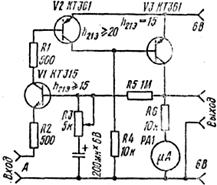 рис. 2. Схема визначення емоційного стану людини. К выходным зажимам прибора подключают гальванометр или самописец. Чувствительность прибора регулируют резистором R1. Устройство пригодно для организации психологических тестов и викторин. 3. ПОСТАНОВКА ЗАДАЧІ Згідно з раніше вказаним, існує способів регістрації медичної інформації. Для їх дослідження необхідно було розробити та виготовити експериментальний макет, на якому було б можливо проводити дослідження принципа їх роботи. Крім того необхідно було розробити методичні вказівки щодо визначення ємоційного стану людини на цьому макеті. 4.ВИБІР СХЕМИ Виберемо нескладну схему для визначення емоційного стану людини, яка складається з чотирьох транзисторів, пяти резисторів постійного опору, одно резистора зі змінним опором, електролітичного конденсатору та мікроамперметра(Рис.14).