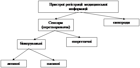 Рис. 1. Класифікація пристроів регістрації медицинської информації. Электроды – это проводники специальной формы, с помощью которых часть электрической цепи, составленная из проводов, соединяется с другой частью этой цепи неметаллического типа проводимости (например, с той или иной частью тела, органом, поверхностью кожи и т.д.). Электроды чаще всего используются для съёма электрического сигнала, реально существующего в исследуемом организме. Они просто выполняют роль контакта, осуществляя отведение электрического сигнала без потерь, зависящей от качества контакта между электродом и той частью организма, с которой от соприкасается. К электродам, как элементам съёма медико – биологической информации, обычно предъявляют специфические требования: - они должны быстро фиксироваться и сниматься; - обладать низкой стоимостью; - обладать высокой стабильностью электрических параметров; - эластичностью при достаточной механической прочности; - не давать артефактов и помех; - не оказывать раздражающего действия. Датчик – (преобразователь медицинской информации) – устройство съёма информации, реагирующий своим чувствительным элементом на воздействие измеряемой величины, а также осуществляющий преобразование этого воздействия в форму, удобную для последующего усиления, регистрации, обработки и т. д. Тип и конструкция датчика зависят от вида необходимого преобразования, т.е. определяются конкретными физическими представлениями входного неэлектрического сигнала и выходного электрического, а также зависят от условий работы датчика. Электроды Важнейшим общим требованием, предъявляемым к различным электродам, является требование минимума потерь полезного сигнала, особенно на переходном сопротивлении электрод – кожа, которое нужно стремиться сделать наименьшим. Величина переходного сопротивления зависит от типа металла, из которого изготовлен электрод, свойств кожи, площади её соприкосновения с электродом и от проводимости проводящей среды между ними. Переходное сопротивление уменьшается также с увеличением площади контакта электрод – кожа. Переходное сопротивление между чистой сухой кожей и электродом измеряется сотнями килоом. Для его уменьшения между кожей и электродом обычно прокладывается марлевая салфетка, смоченная физиологическим раствором. При этом переходное сопротивление снижается до десятков килоом. В последнее время чаще применяют специальные проводящие электродные пасты, которые дают лучший результат, чем простые электролиты. Существует множество типов металлических электродов. В качестве материала для их изготовления применяются золото, платина, серебро, палладий, нержавеющая сталь, сплавы с иридием и др. металлы и химические соединения. Причём, вопрос о влиянии металла и способа обработки на характер получаемых результатов до сих пор остаётся предметом постоянной дискуссии. Конструкции и характеристики электродов зависят во многом от целей их применения. По назначению электроды делятся на четыре группы: 1) для одноразового использования (в кабинетах функциональной диагностики и т.д.); 2) для длительного, непрерывного наблюдения (в условиях палат реанимации, интенсивной терапии); 3) для динамического наблюдения (в условиях физических нагрузок, в спортивной медицине); 4) для экстремального при