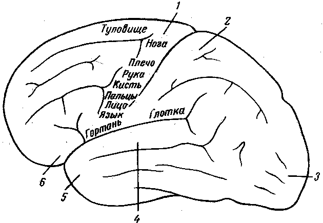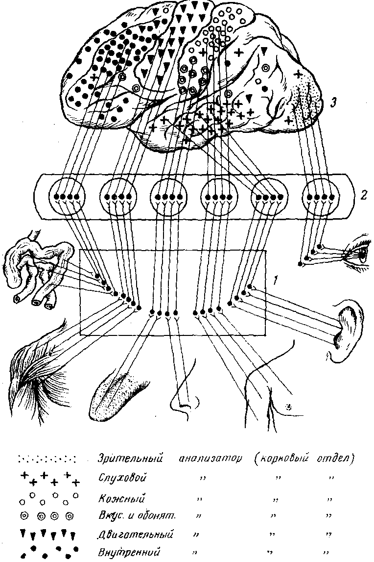 головного мозга. 2. Двигательные функции. 3. Функции кожной и проприорицептивной чувствительности. 4. Слуховые функции. 5. Зрительные функции. 6. Морфологические основы локализации функций в коре головного мозга. - Ядро двигательного анализатора - Ядро слухового анализатора - Ядро зрительного анализатора - Ядро вкусового анализатора - Ядро кожного анализатора 7. Биоэлектрическая активность головного мозга. 8. Литература. ЗНАЧЕНИЕ РАЗЛИЧНЫХ УЧАСТКОВ КОРЫ БОЛЬШИХ ПОЛУШАРИЙ ГОЛОВНОГО МОЗГА С давних времен между учеными идет спор о местонахождении (локализации) участков коры головного мозга, связанных с различными функциями организма. Были высказаны самые разнообразные и взаимно противоположные точки зрения. Одни считали, что каждой функции нашего организма соответствует строго определенная точка в коре головного мозга, другие отрицали наличие каких бы то ни было центров; любую реакцию они приписывали всей коре, считая ее целиком однозначной в функциональном отношении. Метод условных рефлексов дал возможность И. П. Павлову выяснить ряд неясных вопросов и выработать современную точку зрения. В коре головного мозга нет строго дробной локализации фун кций. Это следует из экспериментов над животными, когда после разрушения определенных участков коры, например двигательного анализатора, через несколько дней соседние участки берут на себя функцию разрушенного участка и движения животного восстанавливаются. Эта способность корковых клеток замещать функцию выпавших участков связана с большой пластичностью коры головного мозга. И Рисунок 1. Схема связи отделов коры с рецепторами. 1 – спинной или продолговатый мозг; 2 – промежуточный мозг; 3 – кора головного мозга В центре этих областей находятся скопления наиболее специализированных клеток-так называемые ядра анализатора, а на периферии-менее специализированные клетки. В регуляции функций организма принимают участие не строго очерченные какие-то пункты, а многие нервные элементы коры. Анализ и синтез поступающих импульсов и формирование ответной реакции на них осуществляются значительно большими областями коры. Рассмотрим некоторые области, имеющие преимущественно то или иное значение. Схематическое расположение местонахождения этих областей приведено на рисунке 1. Двигательные функции. Корковый отдел двигательного анализатора расположен главным образом в передней центральной извилине, кпереди от центральной (роландовой) борозды. В этой области находятся нервные клетки, с деятельностью которых связаны все движения организма. Рисунок 2. Схема отдельных областей коры больших полушарий головного мозга. 1 – двигательная область; 2 – область кожной и проприорицептивной чувствительности; 3 – зрительная область; 4 – слуховая область; 5 – вкусовая область; 6 – обонятельная область В передней центральной извилине центры, иннервирующие разные мышечные группы, расположены так, что в верхней части двигательной области находятся центры движений нижних конечностей, затем ниже-центр мышц туловища, еще ниже-центр передних конечностей и, наконец, ниже всех-центры мышц головы. Центры разных мышечных групп представлены неодинаково и занимают неравномерные области. Функции кожной и проприоцептивной чувствительности. Область кожной и проприоцептивной чувствительности у человек