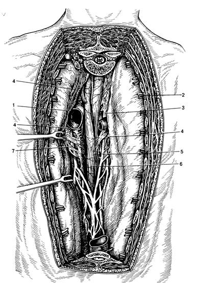 Рис. 2. Топография заднего средостения (по А.Н. Максименкову). 1 аорта: 2 межреберные сосуды; 3—непарная вена; 4—клетчатка средостения; 5—правый блуждающий нерв: б—пищевод; 7- левый блуждающий нерв. В передневерхнем средостении располагаются вилочковая железа, верхняя полая и безымянная вены, дуга аорты, легочная артерия, трахея, бронхи, лимфоузлы, нервные сплетения. В передненижнем отделе- сердце и перикард. В заднем средостении расположены пищевод, часть дуги аорты, блуждающие нервы, симпатические узлы, грудной лимфатический проток, нижняя полая вена, парная и непарная вены. Все промежутки, соединительно-тканные образования средостения представляют собой единое пространство. Четких границ между этими отделами нет, и гнойные процессы могут, распространятся, переходить из одного отдела в другой. Этому способствуют не только недостатки фасциальных и других органных перегородок, но и постоянное движение органов средостения – сокращения сердца, пульсация сосудов, перистальтика пищевода, смещение трахеи и крупных бронхов при кашле и т.д. Но в это же время следует учитывать и клинический опыт: гнойные процессы в средостении распространяются, как правило, в вертикальной плоскости, как бы спускаясь сверху вниз, соответственно в переднем или заднем средостении. Крайне редко гнойный процесс переходит из заднего средостения в переднее и наоборот. В связи с этим деление на клетчатку переднего и заднего средостения следует считать анатомическим понятием. Этиология и патогенез. Абсцессы и флегмоны средостения возникают чаще всего вторично, являясь осложнением каких-либо гнойных или гнилостных процессов в организме – это или непосредственный переход воспаления на медиастинальную клетчатку или метастазирование возбудителей инфекции из определяемых или неустановленных очагов. Большую роль в патогенезе гнойного медиастинита, возникающего контактным путем, играют воспалительные заболевания тканей и органов шеи: флегмоны, раны шеи, гнойный тиреоидит. Нередко причиной являются заболевания и ранения легких и плевры (пневмонии, абсцессы и гангрены легких, эмпиемы, туберкулез, бронхоэктатическая болезнь, огнестрельные ранения легких и плевры, осложненные инфицированием.) Из других заболеваний можно указать на гнойные заболевания костного остова грудной клетки: остеомиелиты грудины, ребер, перихондриты реберных хрящей, остеомиелит грудного отдела позвоночника. Инфекция с гнойного очага непосредственно распространяется на клетчатку средостения. Основную группу пациентов с метастатическими медиастинитами составляют больные с такими первичными источниками, как флегмоны конечностей, остеомиелиты костей нижних конечностей, отморожения, сепсис, ранения нижних конечностей, костей таза, верхних конечностей. Отмечены метастатические формы медиастинитов и при таких инфекционных заболеваниях как дизентерия, язвенный колит, рожа, грипп. При заболеваниях полости рта и зева возможны как непосредственный переход инфекции, так и метастатический путь. Причиной медиастинитов могут стать заглоточные абсцессы, ангина Людовика, флегмонозные паротиты, гнойные заболевания челюстей. Первичные, а по патогенезу – травматические, медиастиниты возникают при экзогенном инфицировании. Это, прежде всего, открытые, в том числе огнестрельные, тр
