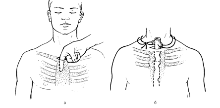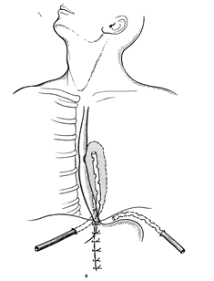 Рис. 4 1) надгрудинная шейная медиастинотомия по Разумовскому при верхне-передних медиастинитах (рис. 4).Больной лежит на спине с валиком под лопатками. Производят поперечный разрез длиной не менее 10-12 см чуть выше рукоятки грудины. Рассекают поверхностные слои и вторую фасцию шеи, тупым путем расслаивают надгрудинный клетчаточный слой, не повреждая яремную венозную дугу, разъеденяют третью фасцию и пальцем проникают за грудину в переднее средостение. При вскрытии и опорожнении гнойника полость его многократно промывают и дренируют.