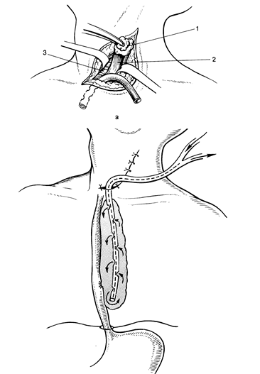 Рис. 7 Шейная медиастинотомия. А - вскрытие гнойника: 1 щитовидная железа, 2 пищевод, 3 трахея; б чресшейное дренирование заднею средостения но Каншину. Операцию заканчивают дренированием средостения. Основным методом, на протяжении многих лет, является метод дренирования при помощи марлевых тампонов, силиконовых трубок и перчаточной резины. В первые сутки послеоперационного периода марлевые салфетки формируют канал для последующего полноценного оттока гнойного содержимого. Удаление марлевых дренажей проводят на 5-7 сутки послеоперационного периода, так как к этому времени они утрачивают дренажную функцию и способствуют задержке гнойного экссудата. После их удаления дренирование осуществляется путем введения перчаточной резины. В послеоперационном периоде наиболее благоприятные условия для дренирования средостения создает постоянная аспирация гнойного содержимого. Метод был предложен P.Lilienthal (1923), но не получил широкого распространения из-за технического несовершенства и недостаточной эвакуации гноя из клетчатки средостения. Н.Н. Каншин и М.М. Абакумов разработали метод дренирования и проточного промывания с длительной аспирацией двухпросветными дренажами. Дренажные трубки выводятся вне хирургической раны, сама рана ушивается для создания герметичности полости дренирования. Более благоприятные условия для промывания полости получены при фракционной аспирации. Гнойную полость заполняют раствором антисептика, а при наличии густого гноя - растворами протеолитических ферментов. Дренажную трубку перекрывают. После экспозиции аспирацией удаляют содержимое из полости гнойника. Такую процедуру повторяют несколько раз в сутки, расходуя до 2-3 литров антисептика. Медиастинит течет очень тяжело. В течение 3-5 суток после операции большое значение придают достаточному обезболиванию, с этой целью назначают наркотические и ненаркотические анальгетики до 4-6 раз в сутки. Инфузионная терапия проводится с целью дезинтоксикации, возмещения потерь жидкости, белков, электролитов. Весьма важную роль играет не только парентеральное, но и энтеральное питание, которое осуществляют через зонд, гастростому или еюностому. Проведение такого энтерального питания показано при медиастинитах, причиной которых послужили повреждения пищевода. Каждому больному в послеоперационном периоде обязательно назначается антибактериальная терапия с подключением не менее 3 антибактериальных препаратов, воздействующих на анаэробную и аэробную флору: полусинтетические пенициллины, цефалоспорины, аминогликозиды, препараты метронидозолового ряда и др. При установлении вида и чувствительности возбудителя проводят коррекцию терапии. Большое внимание уделяется мерам повышения общей неспецифической реактивности организма. В первые сутки послеоперационного периода проводят иммунозаместительную терапию, включающую в себя нативную плазму, лейкоцитарную массу, поливалентный иммуноглобулин, перфузат ксеноселезенки. Кроме того, с целью «протезирования» функции иммунокомпетентных органов применяются методы экстрокорпоральной детоксикации, такие как: плазмоферез, плазмосорбция, лимфосорбция и т.д. При улучшении состояния пациента назначается иммуностимулирующая терапия согласно данным иммунограммы. И, наконец, немаловажное значение уд