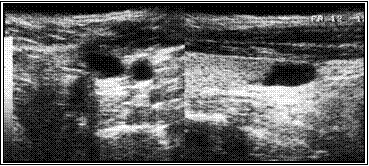 В. Эхограмма через год после склеротерапии. Полная регрессия узла. Примечания: Дополнительные сеансы склеротерапии выполнялись не ранее чем через 1 месяц после первоначального лечения. Показаниями к повторной процедуре служили: сохранение либо нарастание кистозной части, недостаточная регрессия образования. Осложнения Непосредственным осложнением склеротерапии являются субъективные ощущения больного в виде дискомфорта или боли в области шеи, которые могут носить локальный и иррадиирующий характер. В момент введения склеропрепарата большинство пациентов отмечали чувство легкого распирания в месте инъекции, которое чаще всего исчезало после окончания процедуры. Снижение скорости введения этилового спирта уменьшает болевые ощущения. К осложнениям объективного характера можно отнести временный парез или паралич возвратного нерва, а также гипотрофию доли ЩЖ на стороне манипуляции. Уменьшить риск подобных осложнений позволяет четкая визуализация иглы в кисте на протяжении всей процедуры. Эффективность использования метода В клинике МРНЦ РАМН с августа 1999 г. по сентябрь 2001 г. 87 больным с доброкачественной кистозной и кистозно-узловой патологией ЩЖ была выполнена склеротерапия узловых новообразований органа. Возраст больных колебался от 9 до 64 лет и в среднем составил 29 лет. Лиц женского пола было 80, мужского – 7 (соотношение 11,4 : 1). Период наблюдения составил от 1 года до 5-ти лет (в среднем 2 года). У всех больных после склеротерапии отмечена положительная динамика. Полная (на 100% от первоначального объема) регрессия образования была отмечена у 30 (34,5%) пациентов. Еще в 35 (40,2%) наблюдениях размеры узла ЩЖ уменьшились более чем 90 %, т.е. достигнута почти полная регрессия. В 19 (21,8%) случаях степень регрессии узлов ЩЖ варьировала от 60 до 90 %. И только в трех случаях (3,5%) уменьшение объема было менее 50%. При этом было обнаружено, что чем больше степень кистозной дегенерации, тем более эффективна склеротерапия (Табл. 1). Таблица 1. Эффективность склеротерапии спустя один год после проведения в зависимости от степени кистозного содержимого образования ЩЖ.