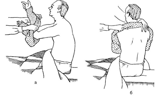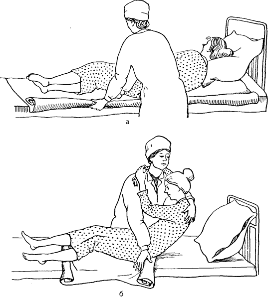 Рис. 2. Смена постельного белья у тяжелобольного. а — первый способ, б — второй способ. При смене рубашки у тяжелобольного (лучше, если на нем будет надета рубашка-распашонка) подводят руку под его спину, подтягивают за край рубашки до затылка, снимают ее через голову и освобождают рукава (рис. 3, а). При повреждении одной из рук сначала снимают рубашку со здоровой. Надевают рубашку, наоборот, начиная с больной руки, и пропускают ее затем через голову по направлению к крестцу больного (рис. 3,б).