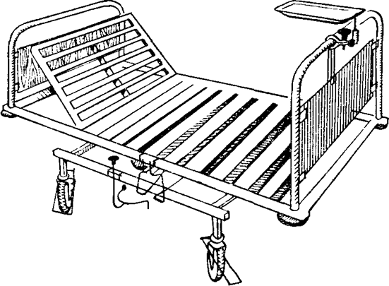 Содержание темы. 1. ПОЛОЖЕНИЕ БОЛЬНОГО И УСТРОЙСТВО ФУНКЦИОНАЛЬНОЙ КРОВАТИ.При многих заболеваниях отмечаются различные изменения положения больного. Активное положение – при удовлетворительном состоянии, когда пациент легко и свободно может осуществлять те, или иные, произвольные движения. Пассивное положение – в случаях невозможности активных движений больных (при бессознательном состоянии, резкой слабости). Вынужденное положение – пациента принимают с целью уменьшения болезненных ощущений. При ортопноэ больной принимает сидячее положение со спущенными вниз ногами, вследствие чего уменьшается застой крови в сосудах легких и несколько ослабляет одышка. Положение больного не всегда совпадает с назначенным ему двигательным режимом. Существует 4-е вида двигательного режима: Строгий постельный – больному не разрешается даже поворачиваться; Постельный – можно поворачиваться в постели, но не покидать ее; Полу постельный - можно вставать, например в туалет; Общий – не существует ограничений двигательной активности. Например, больные в первые сутки инфаркта миокарда должна соблюдать строгий постельный режим даже в случае их активного положения. Для обеспечения тяжелобольному удобного положения в постели, возникает необходимость в использование функциональной кровати (рис 1.), головной и ножной конец которой можно быстро перевести в нужное положение (поднять, опустить). С этой целью в кроватной сетке предусматривается несколько секций, положение которых меняется поворотом соответствующей ручки. Подъем или опускание головной части кровати нажатием специальной ручки может производить сам больной, не прикладывая для этого почти никаких усилий. Детские кровати, а также кровати для беспокойных больных оборудуются боковыми сетками.