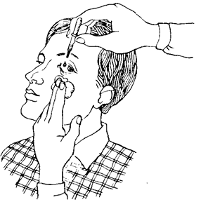 Рис. 11. Подстригание ногтей тяжелобольного на руках и ногах. 5. УХОД ЗА ПОЛОСТЬЮ РТАСреди правил личной гигиены важное место занимает уход за полостью рта. При многих тяжелых заболеваниях, особенно сопровождающихся высокой лихорадкой, происходит значительное ослабление сопротивляемости организма, в результате чего в полости рта могут активно размножаться микробы, существующие там и в нормальных условиях, приводя к развитию различных поражений зубов (пульпита, периодонтита, пародонтоза), десен (гингивита), слизистой оболочки (стоматита), появлению трещин в углах рта, сухости губ. С целью их предупреждения больные должны регулярно не реже 2 раз в день чистить зубы, полоскать рот после каждого приема пищи. Тяжелобольным промывают полость рта 0,5 % раствором гидрокарбоната натрия, изотоническим раствором хлорида натрия, слабым раствором перманганата калия. Промывание чаще всего осуществляют с помощью шприца Жане или резинового баллончика. При этом чтобы жидкость не попала в дыхательные пути, больному придают полу сидячее положение с несколько наклоненной вперед головой или же поворачивают голову набок, если больной лежит. Для лучшего оттока жидкости шпателем несколько оттягивают угол рта. При некоторых заболеваниях полости рта, глотки, миндалин для выявления их возбудителей берут мазок со слизистой оболочки полости рта и глотки. Делают это специальным чистым тампоном, помещая его затем в заранее приготовленную стерильную пробирку. 6. УХОД ЗА ГЛАЗАМИУход за глазами осуществляют при наличии выделений, склеивающих ресницы и веки, появляющихся обычно при воспалении слизистой оболочки век (конъюнктивитах). В таких случаях с помощью ватного тампона, смоченного 2 % раствором борной кислоты, вначале размягчают и удаляют образовавшиеся корочки, а затем промывают конъюнктивальную полость кипяченой водой или физиологическим раствором. При этом веки раздвигают указательным и большим пальцами левой руки, а правой рукой, не касаясь век, производят орошение конъюнктивального мешка с помощью резинового баллончика. При закапывании глазных капель или закладывании глазной мази нижнее веко оттягивают влажным тампоном, после чего пипеткой выпускают 1 – 2 капли (комнатной температуры!) на слизистую оболочку нижнего века (рис. 12) или туда же широким концом небольшой стеклянной палочки наносят глазную мазь. Рис. 12. Закапывание больному глазных капель.