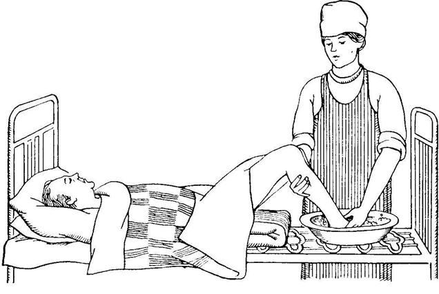 Рис. 5. Мытье ног тяжелобольного в постели. При отсутствии противопоказаний