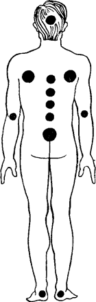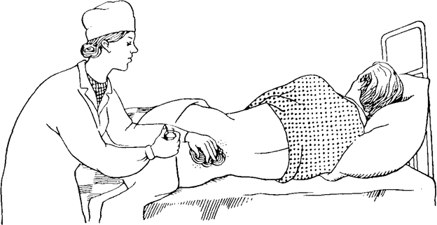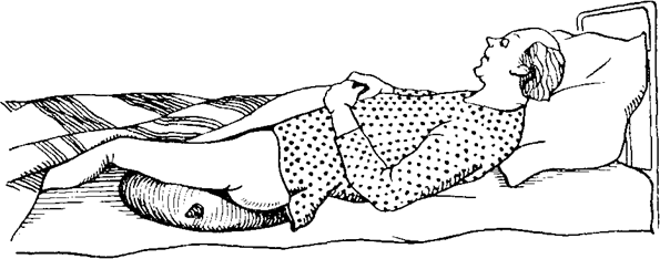 Пролежни – глубокие поражения кожи с исходом в ее омертвение, возникающие при длительном сдавливании мягких тканей между костными образованиями и внешними предметами, например поверхностью матраца, гипсовой лангетой и др. Пролежни особенно часто развиваются в области крестца, копчика, лодыжек, бугра пяточной кости, мыщелков и вертела бедра (рис. 7). Рис. 7. Места наиболее частого образования пролежней. К развитию пролежней предрасполагают глубокие нарушения обменных процессов в организме (например, при сахарном диабете), тяжелые нарушения мозгового кровообращения, обширные травмы с повреждением головного мозга. Во многих случаях, однако, образованию пролежней способствует плохой уход за больным – небрежный уход за кожными покровами, несвоевременное перестилание постели, недостаточная активизация пациента и т. д. В своем развитии пролежни проходят несколько стадий: побледнение, а затем и покраснение кожных покровов с появлением синюшных пятен, образование пузырей, отслойка эпидермиса с развитием некроза кожи, подкожной клетчатки, фасций, сухожилий и т. д. Пролежни нередко осложняются присоединением вторичной гнойной или гнилостной инфекции с крайне неблагоприятным прогнозом. Профилактика пролежней сводится к постоянному контролю за состоянием постели тяжелобольного и его нательным бельем (своевременное устранение неровностей, грубых швов, разглаживание складок, стряхивание крошек). В профилактических целях применяют также специальные подкладные резиновые круги, которые помещают под те области тела, которые подвергаются длительному давлению (например, под крестец). Подкладной круг должен быть надут довольно слабо, чтобы он изменял свою форму при движениях больного (рис. 8). Вместо подкладного круга могут использоваться тканевые матрацы, наполненные, например, льняным семенем, а также специальные прорезиненные матрацы, состоянию из многих воздушных камер. Степень наполнения воздухом отдельных камер автоматически изменяется каждые три минуты, так что происходят постоянные подъем и опускание различных секций матраца, вследствие чего точки соприкосновения его с телом больного все время оказываются различными. Рис. 8. Применение подкладного круга.
