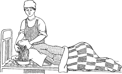 Рис. 9. Обработка больного с пролежнями. Лечить образовавшиеся пролежни значительно труднее, чем предупредить их возникновение. В начальных стадиях рекомендуют смазывание пораженных участив 5–10 % раствором йода, 1 % раствором бриллиантовой зелени, применение физиотерапевтических методов (УВЧ, ультрафиолетовое облучение). Поверхность пролежней покрывают асептической повязкой. После отторжения некротических масс применяют различные мазевые повязки общестимулирующую терапию (переливание крови плазмы), в некоторых случаях - операцию пересадки кожи. 4. УХОД ЗА ВОЛОСАМИ