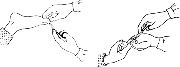 Плохой уход за волосами с нерегулярным мытьем может приводить к их повышенной ломкости, выпадению, образованию кожных покровах головы жирных или сухих отрубевидных чешуек (перхоти). Рис. 10. Мытье головы тяжелобольного в постели. Жирные волосы рекомендуют мыть 1 раз в неделю, а сухие и нормальные – 1 раз в 10 – 14 дней, Мытье головы у тяжелобольного проводят в постели (рис. 10). При этом тазик размещают у головного конца кровати, а голову больного несколько приподнимают и запрокидывают. Для мытья волос лучше использовать мягкую воду (кипяченую или с добавлением тетрабората натрия из расчета 1 чайная ложка на 1 л воды). Лучше пользоваться приготовленной мыльной пеной. После мытья волосы осторожно вытирают полотенцем, после чего тщательно и бережно расчесывают, начиная от корня, если волосы короткие, или же, наоборот, с концов при длинных волосах. Необходимо также осуществлять систематический уход за ногтями, регулярно удаляя грязь, скапливающуюся под ними, и коротко подстригая их не реже одного раза в неделю (рис. 11).