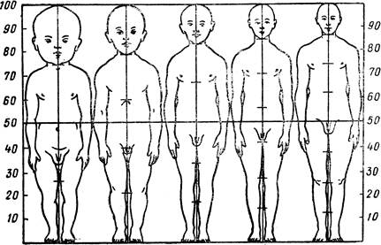Таб. 1. Изменение темпов роста детей с возрастом размеры тела и органов, массу, окостенение скелета, прорезывание зубов, развитие желез внутренней секреции, степень полового созревания, мышечную силу. В этой схеме учтены особенности мальчиков и девочек. Однако вопрос о критериях биологического возраста, в том числе выявление наиболее информативных показателей, отражающих функциональные возможности организма, которые могли бы явиться основой возрастной периодизации, требует дальнейшей разработки. Каждый возрастной период характеризуется своими специфическими особенностями. Переход от одного возрастного периода к последующему обозначают как переломный этап индивидуального развития, или критический период. Продолжительность отдельных возрастных периодов в значительной степени подвержена изменениям. Как хронологические рамки возраста, так и его характеристики определяются прежде всего социальными факторами. Рост и пропорции тела на разных этапах развития. Характерной особенностью процесса роста детского организма являются его неравномерность и волнообразность. Периоды усиленного роста сменяются его некоторым замедлением. Особенно ярко эта закономерность прослеживается при графическом выражении темпа роста организма ребенка (таб. 1). Наибольшей интенсивностью рост ребенка отличается в первый год жизни и в период полового созревания, т. е. в 11—15 лет. Если при рождении рост ребенка в среднем равен 50 см, то к
