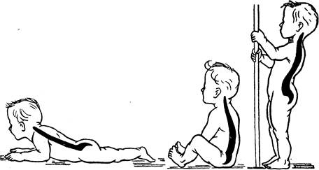 Рис. 2. Формирование изгибов позвоночника в онтогенезе ребенка Рост позвоночного столба наиболее интенсивно происходит в первые 2 года жизни. В течение первых полутора лет жизни рост различных отделов позвоночника относительно равномерен. Начиная с 1,5 до 3 лет замедляется рост шейных и верхнегрудных позвонков и быстрее начинает увеличиваться рост поясничного отдела, что характерно для всего периода роста позвоночника. Усиление темпов роста позвоночника отмечается в 7—9 лет и в период полового созревания, после завершения которого прибавка в росте позвоночника очень невелика. Структура тканей позвоночного столба существенно изменяется с возрастом. Окостенение, начинающееся еще во внутриутробном периоде, продолжается в течение всего детского возраста. До 14 лет окостеневают только средние части позвонков. В период полового созревания появляются новые точки окостенения в виде пластинок, которые сливаются с телом позвонка после ,20 лет. Процесс окостенения отдельных позвонков завершается с окончанием ростовых процессов — к 21—23 годам. Позднее окостенение позвоночника обусловливает его подвижность и гибкость в детском возрасте. Кривизна позвоночника, являющаяся его характерной особенностью, формируется в процессе индивидуального развития ребенка. В самом раннем возрасте, когда ребенок начинает держать головку, появляется шейный изгиб, направленный выпуклостью вперед (лордоз). К 6 месяцам, когда ребенок начинает сидеть, образуется грудной изгиб с выпуклостью назад (кифоз). Когда ребенок начинает стоять и ходить, образуется поясничный лордоз (рис. 2). С образованием поясничного лордоза центр тяжести перемещается кзади, препятствуя падению тела при вертикальном положении. К году имеются уже все изгибы позвоночника. Но образовавшиеся изгибы не фиксированы и исчезают при расслаблении мускулатуры, К 7 годам уже имеются четко выраженные шейный и грудной изгибы, фиксация поясничного изгиба происходит позже— в 12—14 лет. Изгибы позвоночного столба составляют специфическую особенность человека и возникли в связи с вертикальным положением тела. Благодаря изгибам позвоночный столб пружинит. Удары и толчки при» ходьбе, беге, прыжках ослабляются и затухают, что предохраняет мозг от сотрясений. Нарушения кривизны позвоночного столба, которые могут возникнуть в результате неправильной посадки ребенка за столом и партой, приводят к неблагоприятным последствиям в его здоровье. b)Грудная клетка. Грудная клетка образует костную основу грудной полости. Она защищает сердце, легкие, печень и служит местом прикрепления дыхательных мышц и мышц верхних конечностей. Грудная клетка состоит из грудины, 12 пар ребер, соединенных сзади с позвоночным столбом. Форма грудной клетки существенно изменяется с возрастом. В грудном возрасте она как бы сжата с боков, ее переднезадний размер больше поперечного (коническая форма). У взрослого же преобладает поперечный размер. На протяжении первого года жизни постепенно меняется форма грудной клетки, что связано с изменением положения тела и центра тяжести. Уменьшается угол ребер по отношению к позвоночнику. Соответственно изменению грудной клетки увеличивается объем легких. Изменение положения ребер способствует увеличению движений грудной клетки и позволяет эффективнее осуществлять дыхательн