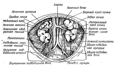 рис.3 С возрастом меняется сосудистая сеть почек. Возрастные изменения артериальной системы почек выражаются в утолщении наружной и внутренней стенок артерий и уменьшении толщины средней стенки. При этом как во внутреннем, так и в наружном слое появляются в большом количестве гладкомышечные клетки. Только к 14 годам толщина артериальной стенки сосудов почек оказывается такой же, как и у взрослых. В венозном сплетении почек новорожденных невозможно выделить отдельные стволы. Последние появляются только в 6-месячном возрасте. В 2—4 года схема строения вен почек такая же, как и у взрослых. Лимфатическая система почечных лоханок у детей связана с лимфатической системой кишечника более тесно, чем у взрослых. В связи с этим у детей возможно распространение кишечных бактерий из кишечника в почечные лоханки, что приводит к возникновению в них воспалительного процесса. У новорожденных детей почки расположены несколько выше, чем у взрослых. Верхний полюс почек у них соответствует нижнему краю 11-го грудного позвонка; только к 2 годам уровень расположения почек оказывается таким же, как и у взрослых. a)Возрастные особенности функции почек. С возрастом меняются количество и состав мочи. Мочи у детей отделяется сравнительно больше, чем у взрослых, а мочеиспускание происходит чаще за счет интенсивного водного обмена и относительно большого количества воды и углеводов в рационе питания ребенка. Только в первые 3—4 дня количество отделяющейся мочи у детей невелико. У месячного ребенка мочи отделяется в сутки 350—380 мл, к концу первого года жизни —750 мл, в 4—5 лет — около 1 л, в 10 лет—1,5 л, а в период полового созревания — до 2 л. У новорожденных реакция мочи резкокислая, с возрастом она становится слабокислой. Реакция мочи может меняться в зависимости от характера получаемой ребенком пищи. При питании преимущественно мясной пищей в организме образуется много кислых продуктов обмена, соответственно и моча становится более кислой. При употреблении растительной пищи реакция мочи сдвигается в щелочную сторону. У новорожденных детей повышена проницаемость почечного эпителия, отчего в моче почти всегда обнаруживается белок. Позже у здоровых детей и взрослых белка в моче быть не должно. b)Мочеиспускание и его механизм. Испускание мочи — процесс рефлекторный. Поступающая в мочевой пузырь моча вызывает повышение давления в нем, что раздражает рецепторы, находящиеся в стенке пузыря. Возникает возбуждение, доходящее до центра мочеиспускания в нижней частит спинного мозга. Отсюда импульсы поступают к мускулатуре пузыря, заставляя ее сокращаться; сфинктер при этом расслабляется и моча поступает из пузыря в мочеиспускательный канал. Это непроизвольное испускание мочи. Оно имеет место у грудных детей. Старшие дети, как и взрослые, могут произвольно задерживать и вызывать мочеиспускание. Это связано с установлением корковой, условнорефлекторной регуляции мочеиспускания. Обычно к двухлетнему возрасту у детей сформированы условнорефлек-торные механизмы задержки мочеиспускания не только днем, но и ночью. Однако в возрасте 5—10 лет у детей, иногда до полового созревания, встречается ночное непроизвольное недержание мочи — энурез. В осенне-зимние периоды года в связи с большей возможностью охлаждения организма энурез учащается. С возрастом энурез, с
