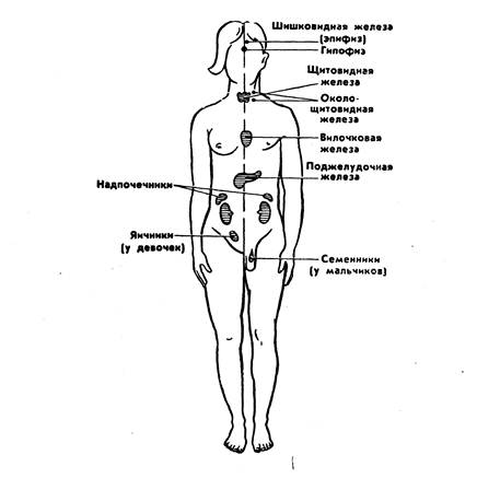 Рис. 4. Схема расположения эндокринных желез b)Надпочечники. Надпочечные железы уже с первых недель жизни характеризуются бурными структурными преобразованиями. Развитие кори надпочечников интенсивно протекает в первые годы жизни ребенка. К 7 годам ее ширина достигает 881 мкм, в 14 лет она составляет 1003,6 мкм. Мозговое вещество надпочечников к моменту рождения представлено незрелыми нервными клетками. Они быстро в течение первых лет жизни дифференцируются в зрелые клетки, называемые хромофильными, так как отличаются способностью окрашиваться в желтый цвет хромовыми солями. Эти клетки синтезируют гормоны, действие которых имеет много общего с симпатической нервной системой,— катехоламины (адреналин и норадреналин). Синтезированные катехоламины содержатся в мозговом веществе в виде гранул, из которых освобождаются под действием соответствующих стимулов и поступают в венозную кровь, оттекающую от коры надпочечников и проходящую через мозговое вещество. Стимулами поступления катехоламинов в кровь является возбуждение, раздражение симпатических нервов, физическая нагрузка, охлаждение и др. Главным гормоном мозгового вещества является адреналин, он составляет примерно 80% гормонов, синтезируемых в этом отделе надпочечников. Адреналин известен как один из самых быстродействующих гормонов. Он ускоряет кругооборот крови, усиливает и учащает сердечные сокращения; улучшает легочное дыхание, расширяет бронхи; увеличивает распад гликогена в печени, выход сахара в кровь; усиливает сокращение мышц, снижает их утомление и т. д. Все эти влияния адреналина ведут к одному общему результату —мобилизации всех сил организма для выполнения тяжелой работы. Повышенная секреция адреналина — один из важнейших механизмов перестройки в функционировании организма в экстремальных ситуациях, при эмоциональном стрессе, внезапных физических нагрузках, при охлаждении. Тесная связь хромофильных клеток надпочечника с симпатической нервной системой обусловливает быстрое выделение адреналина во всех случаях, когда в жизни человека возникают обстоятельства, требующие от него срочного напряжения сил. Значительное нарастание функционального напряжения надпочечников отмечается к 6 годам и в период полового созревания. В это же время значительно увеличивается содержание в крови стероидных гормонов и катехоламинов. c)Поджелудочная железа. У новорожденных внутрисекреторная ткань поджелудочной железы преобладает над внешнесекреторной. Островки Лангерганса значительно увеличиваются в размерах с возрастом. Островки большого диаметра (200—240 мкм), свойственные взрослым, обнаруживаются после 10 лет. Установлено и повышение уровня инсулина в крови в период от 10 до 11 лет. Незрелость гормональной функции поджелудочной железы может явиться одной из причин того, что у детей сахарный диабет выявляется чаще всего в возрасте от 6 до 12 лет, особенно после перенесения острых инфекционных заболеваний (корь, ветряная оспа, свинка). Отмечено, что развитию заболевания способствует переедание, в особенности избыточность богатой углеводами пищи. 9. ВОЗРАСТНЫЕ ОСОБЕННОСТИ ПОЛОВЫХ ЖЕЛЕЗ. Мужские и женские половые железы (семенники и яичники),, сформировавшись в период внутриутробного развития, подвергаются медленному Морфологическому и функциональному созре