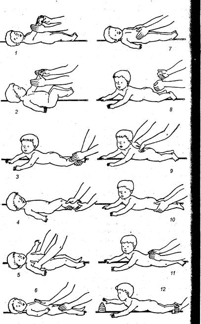 2. Массаж ног. Взять правую ножку ребенка в ладонь правой руки, а левой проводить поглаживание от стопы к паховому сгибу сначала по задней, затем по наружной поверхности голени и бедра. Левую ножку массируют правой рукой. Повторить 8—10 раз. 3. Массаж стоп. Взять правую ножку ребенка за голень левой рукой. Тыльной стороной пальцев правой руки растирать подошву от пальцев к пятке и обратно. Повторить 10 раз. 4. Упражнение для стоп. Указательным пальцем правой руки нажать на ступню ребенка у основания пальцев, вызвав подошвенное сгибание. Этим же пальцем пройтись от пальцев к пятке. В ответ ребенок должен разгибать пальцы стоп. Повторите 5 раз. 5. Упражнение для туловища. Взять ребенка обеими руками за верхнюю часть туловища и легко покачивать влево и вправо, не нажимая на ребра. Повторить 6—8 раз. 6. Массаж живота. Правой рукой поглаживать левую половину живота сверху вниз и одновременно левой рукой — правую половину снизу вверх. Повторить 8 раз. 7. Массаж груди. Пальцами и ладонями обхватить грудную клетку малыша. Передвигать руки по ходу межреберных промежутков от середины к бокам. Повторить 8 раз. 8. Массаж позвоночника. Положить ребенка на левый бок. Слегка нажимая двумя пальцами левой руки, продвигать их вдоль позвоночника от крестца к шее. В ответ ребенок должен прогнуться в позвоночнике. Повторить 2—3 раза. 9. Массаж спины. Обеими ладонями поглаживать спину от шеи к ягодицам, а затем тыльной стороной ладоней и пальцев — в обратном направлении. 10. Массаж ног. Держа левую ножку в правой руке, левой разминать легонько мышцы задней и боковой поверхности голени и бедра. Правую ножку массировать правой рукой. Повторить 4—6 раз. 11. Массаж ягодиц. Тыльной поверхностью обеих рук легкими движениями похлопывать по ягодицам малыша (до 10 раз). 12. Согнуть ножки ребенка и соединить стопы так, чтобы они упирались в ваши ладони. Побуждайте к ползанию, легко подталкивая подошвы. ГИМНАСТИЧЕСКИЕ КОМПЛЕКСЫ ДЛЯ ДЕТЕЙ ОТ 9 ДО 12 МЕСЯЦЕВЗанятия помогут ребенку увереннее сделать свои первые шаги. Она способствует закаливанию — ведь в это время малыш раздет. Физический контакт с матерью или с отцом рождает у ребенка чувство защищенности, успокаивает, вызывает целую гамму положительных эмоций. 1. Круговые движения руками. Выполнять с кольцами. 2. Поднимание выпрямленных ног. Положите ребенка на спину и, держа на высоте его выпрямленных ног гладкую палочку или большую яркую игрушку, побуждайте его, подняв ножки, коснуться ее. В первый раз помогите ему; еще два-три раза — он, вероятно, с удовольствием проделает это сам. 3. Топанье. Малыш лежит в том же положении — на спине. Ноги согнуты в тазобедренных и коленных суставах, стопы упираются в стол. Приговаривая "топ-топ-топ", покажите ему, как можно топать по столу. Получится что-то вроде бега на месте. 4. Поворот со спины на живот. Для стимула можно использовать привлекательную игрушку, помещая ее то справа, то слева, чтобы ребенок повернулся несколько раз в обе стороны. Он уже понимает или очень скоро начнет понимать просьбу "Повернись на животик" и поощряющие слова "Хорошо, молодец, очень хорошо!" 5. Вставание на ноги из положения лежа на животе. Дайте малышу в руки кольца и, легко потягивая за них, помогите ему встать сначала на колени, а потом и на ноги. 6. Наклоны и выпрямления туловища. Поставьте ребенка, прислонив его спиной к с