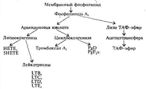 моноцит Важное значение придается лейкотриенам (LTB4, LTC4, LTD4, LTE4) и простагландину D2, тромбоцит-активирующему фактору, образующихся из арахидовой кислоты и мембранных фосфолипидов. Бронхоконстрикция, определяющаяся LTC4, LTD4, LTE4, PgD2 не снимается бета-стимуляторами, кроме того они вызывают повышение сосудистой проницаемости и стимулируют образование мукозы. Лейкотриен В4, и PgD2 обладает свойствами стимулировать хемотаксис и вызывают хемокинезис нейтрофилов, а тромбоцит-активирующий фактор, наряду с хемотаксисом нейтрофилов, и макрофагов. Схема образования лейкотриенов, простагландинов и тромбоцит-активируюшего фактора