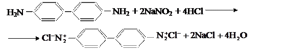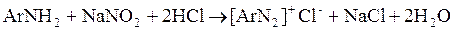 Практическое значение имеют азокрасители более сложного строения. Азокрасители получают из ароматических аминов и оксисоединений при помощи сравнительно простых реакций диазотирования и азосочетания которые будут рассмотрены подробно. При этом используют большое количество амино- и оксисоединений бензольного и нафталинового ряда с различными заместителями, простыми и сложными. Это даёт возможность получать красители всех цветов и оттенков – от лимонно-жёлтого до глубоко-чёрного. По технической классификации среди азокрасителей имеются прямые, кислотные, протравные, основные, красители для ацетатного шёлка, компоненты красителей, образующихся на волокне, пигменты и др. Азокрасители широко применяются для крашения растительных, животных и синтетических волокон, резины, кожи, пластических масс, в лакокрасочной, полиграфической и других областях промышленности. В основе технологии получения азокрасителей лежат две химические реакции: 1) диазотирование ароматического амина, 2) сочетание полученного диазосоединения с амином или фенолом. 3.2. Реакция диазотированияДиазотированием называют взаимодействие первичного ароматического амина с азотистой кислотой в присутствии избытка минеральной кислоты. Как правило, минеральная кислота берётся в некотором избытке (2,5 эквивалента на 1 эквивалент амина). При этом образуется диазосоединение. Азотистая кислота неустойчива и легко разлагается, поэтому при диазотировании применяют не свободную азотистую кислоту, а её соль – нитрит натрия. Эта соль при действии на неё минеральной кислоты (обычно соляной, реже – серной) образует азотистую кислоту, которая вступает в реакцию с амином. Поэтому часть минеральной кислоты, взятой для реакции, расходуется на разложение нитрита натрия с образованием азотистой кислоты: NaNO2 + HCl → HNO2 + NaCl. Схему реакции диазотирования, в присутствии соляной кислоты, можно представить в общем виде: