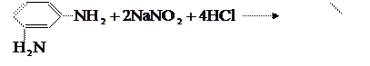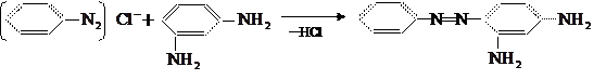 Образовавшееся бисдиазосоединение легко вступает в реакцию сочетания с исходным м-фенилдиамином; при этом образуется краситель. Диазотирование n-диаминов осложняется их склонностью к окислению, которое особенно легко протекает в среде концентрированной серной кислоты. Поэтому красители на основе бисдиазотированного n-фенилдиамина (т.е. дисазокрасители) получают не из n-фенилдиамина, а из n-нитроанилина или N-ацетил-n-фенилдиамина. n-Нитроанилин диазотируют, получают краситель на основе этого диазосоединения (моноазокраситель), а затем в полученном красителе восстанавливают нитрогруппу в аминогруппу, диазотируют её и переводят в дисазокраситель. Бензидин и другие амины, в которых аминогруппы расположены в разных