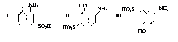 Большое практическое значение в качестве азосоставляющих имеют нафтолсульфокислоты и аминонафтолсульфокислоты. При сочетании диазосоединений с нафтолсульфокислотами диазогруппа вступает главным образом в положение, соседнее с гидроксильной группой. Азосоставляющую растворяют в содовом или щелочном растворе. Особое место среди азосоставляющих занимают аминонафтолсульфокислоты, в частности Аш-кислота (I), гамма-кислота (II) и И-кислота (III):