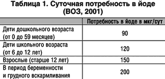 Реферат: Препараты йода в клинической медицинеРеферат: Препараты йода в клинической медицинеК.м.н. В.В. Фадеев, ММА имени И.М. Сеченова Синтез тиреоидных гормонов и обмен йода Закладка щитовидной железы происходит на 3–4 неделе эмбрионального развития из энтодермы, как выпячивание стенки глотки между 1 и 2 парами жаберных карманов. Примерно с 10–12 недели беременности щитовидная железа приобретает способность захватывать йод, а спустя короткое время она уже способна синтезировать и секретировать тиреоидные гормоны. Поступающий с пищей йод быстро и практически полностью всасывается в тонкой кишке как неорганический йодид. Концентрация йодида в плазме крови при нормальном поступлении йода в организм составляет 10–15 мкг/л, при этом общий эстрацеллюлярный пул йода составляет около 250 мкг. Большая часть йода (90%), поступающего в организм, выводится из него с мочой. Основной функцией щитовидной железы является обеспечение организма тиреоидными гормонами: тироксином (Т4) и трийодтиронином (Т3). В начале йодид за счет работы натрий–йодидного симпортера активно поступает в тироцит против градиента концентрации. Далее йодид достигает апикальной мембраны, окисляется и органифицируется, присоединяясь к тирозильным остаткам тиреоглобулина. Йодирование тиреоглобулина происходит у апикальной мембраны тироцита под действием пероксидазы тироцитов. На очередном этапе синтеза тиреоидных гормонов, после йодирования тирозильных остатков, происходит пространственное изменение структуры тиреоглобулина, в результате чего происходит конденсация йодированных тирозинов с образованием тиреоидных гормонов. Щитовидная железа является единственной эндокринной железой, которая вследствие постоянно варьирующего поступления субстрата для синтеза гормонов (йода) запасает очень большие количества своего продукта. Так, запаса тиреоидных гормонов, постоянно содержащихся в щитовидной железе, хватило бы примерно на 2 месяца. При одномоментном поступлении в организм очень большого количества йода (фармакологические дозы) развивается так называемый феномен Вольфа–Чайкова, который подразумевает временную (примерно на 14 дней) блокаду захвата йода щитовидной железой и синтеза тиреоидных гормонов. Этот феномен предотвращает поступление в щитовидную железу избытка йода и синтез избытка тиреоидных гормонов. В прошлом (а в отдельных случаях и в настоящее время) феномен Вольфа–Чайкова использовался для предоперационной подготовки больных токсическим зобом. Понятие о физиологических и фармакологических дозах йода ВОЗ совместно с другими международными организациями установила, что суточная потребность в йоде составляет 100–200 мкг (мкг – это миллионная доля грамма) (табл. 1). За всю жизнь человек потребляет около 3–5 граммов йода, что эквивалентно содержимому примерно одной чайной ложки.
