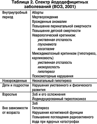 Суточные дозы йода до 1000 мкг (1 мг) считаются физиологическими и не могут обусловить развитие какой–либо патологии у здорового человека. Более высокие дозы йода называются фармакологическими. Как правило, такое количество йода человек может получить только с лекарственными препаратами. Некоторые отхаркивающие средства содержат огромное количество йода. Каждая таблетка амиодарона содержит 60 мг йода, что эквивалентно годовой физиологической потребности в этом микроэлементе. Аналогичным образом, того количества йода, которое содержится в одной капле раствора Люголя (6,3 мг йода), хватило бы более чем на месяц, а в 1 мл спиртовой настойки йода (40 мг йода) – примерно на 200 дней. С целью профилактики и лечения йододефицитных заболеваний используются только физиологические дозы йода (100–200 мкг), которые содержатся в соответствующих лекарственных препаратах и минерально–витаминных комплексах. Использование с этой целью биологически–активных пищевых добавок (БАД) не рекомендуется в связи с отсутствием точной информации о содержании в них йода. При использовании йодированной соли, которое признано основным методом массовой йодной профилактики, в организм человека попадает как раз около 100–200 мкг йода. Концепция йододефицитных заболеваний В патологии человека наибольшее значение имеет дефицит йода. В настоящее время признано, что йодный дефицит является естественным и всеобщим природным феноменом. Отсутствие дефицита йода в той или иной популяции может быть связано либо с адекватно проводимой массовой йодной профилактикой, либо со специфическим характером питания, например, как в Японии, где потребляется очень большое количество богатых йодом морепродуктов. Йодный дефицит имеет место на всей территории Российской Федерации, равно как и во многих других странах, в частности, в большинстве стран Европы. До самого последнего времени йодный дефицит у большинства людей и медиков ассоциировался исключительно с проблемой эндемического зоба. Тем не менее исследования последних нескольких десятилетий показали, что зоб является далеко не единственной и не самой тяжелой проблемой, которую несет с собой йодный дефицит. В середине 80–х годов XX века австралийским ученым Бэзилом Хетцелем была выдвинута концепция йододефицитных заболеваний. Йододефицитными заболеваниями (ЙДЗ), по определению ВОЗ, обозначаются все патологические состояния, развивающиеся в популяции в результате йодного дефицита, которые могут быть предотвращены при нормализации потребления йода. Недостаточность поступления йода в организм приводит к развертыванию цепи последовательных приспособительных процессов, направленных на поддержание нормального синтеза и секреции гормонов щитовидной железы. Но если дефицит йода сохраняется достаточно долго, происходит срыв механизмов адаптации с последующим развитием ЙДЗ. Этот термин подчеркивает тот факт, что заболевания щитовидной железы являются далеко не единственным и не самым тяжелым последствием дефицита йода (табл. 2).