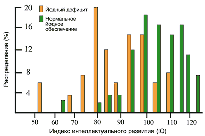 Препараты йода и профилактика нарушений психического развития Во время беременности, особенно в ее первой половине, под воздействием комплекса специфических факторов происходит значительная стимуляция щитовидной железы. Такими специфическими факторами являются гипепродукция хорионического гонадотропина, эстрогенов и тироксинсвязывающего глобулина (ТСГ), увеличение почечного клиренса йода и изменение метаболизма тиреоидных гормонов беременной в связи с активным функционированием фетоплацентарного комплекса. При достаточном количестве основного субстрата для синтеза тиреоидных гормонов, то есть йода, эти изменения легко компенсируются. В результате воздействия всех перечисленных стимулирующих факторов в норме продукция Т4 во время беременности возрастает примерно на 30–50%. Наибольшее значение это имеет в первой половине беременности, когда у плода еще не функционирует собственная щитовидная железа, но при этом происходит формирование основных структур нервной системы. Йодный дефицит еще до беременности приводит к тому, что щитовидная железа женщины функционирует, используя резервные возможности. Дальнейшее повышение потребности в йоде, которое происходит во время беременности, может приводить к относительной функциональной гестационной гипотироксинемии (относительной по отношению к ожидаемому повышению уровня тироксина на ранних сроках беременности при адекватном поступлении в организм йода). Адекватное развитие головного мозга в неонатальном периоде во многом зависит от интрацеребрального уровня Т4, который напрямую коррелирует с уровнем свободного Т4 плазмы. При дефиците тиреоидных гормонов у плода наблюдается уменьшение массы головного мозга и содержания в нем ДНК, а также ряд гистологических изменений. Показатели умственного развития населения (IQ–индекс), проживающего в регионах йодной недостаточности, достоверно (на 10–15%) ниже таковых в регионах без дефицита йода (рис. 1). Причиной этого, как указывалось, является неблагоприятное воздействие даже умеренного йодного дефицита в период формирования центральной нервной системы, в первую очередь в перинатальном периоде. Наряду с риском нарушения развития нервной системы плода в условиях легкого йодного дефицита примерно у 15% женщин формируется зоб.