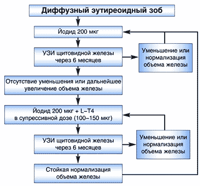 Рис. 1. Интеллектуальное развитие детей 2,5-6 лет, проживающих в областях Испании с различным обеспечением йодом (Bleichrodt N., 1989) В связи с вышесказанным во время беременности риск развития тяжелых йододефицитных заболеваний наиболее высок, что требует специальных профилактических мер. Наряду с использованием йодированной соли всем беременным и кормящим грудью женщинам, проживающим в регионах йодного дефицита рекомендуется активное профилактическое назначение препаратов, содержащих физиологические (200 мкг) дозы йода. Примером такого препарата может служить Йодид (фармацевтическая компания Никомед), в одной таблетке которого содержится 100 или 200 мкг активного йода в виде калия йодида. Препарат назначается беременным и кормящим женщинам в дозе 150–200 мкг в день (1,5–2 таблетки Йодид 100 или 3/4–1 таблетку Йодид 200). В ряде клинических исследований установлена высокая эффективность применения физиологических доз Йодида: через месяц от начала йодной профилактики у беременных женщин уровень йодурии возрастал более чем в 3 раза и достигал 134,0 мкг/л. Также на фоне проводимой йодной профилактики препаратом Йодид 100 (Йодид 200) выявлено повышение концентрации йода в грудном молоке, увеличилась продолжительность грудного вскармливания. Важным результатом применения Йодида явилось уменьшение частоты неонатальной гипертиреотропинемии и транзиторного гипотиреоза. Йодная профилактика сопровождалась достоверным увеличением показателей длины и массы тела у детей как при рождении, так и к году жизни. Препараты йода в лечении зоба Наиболее частой причиной эутиреоидного, то есть протекающего без нарушения функции щитовидной железы, зоба является дефицит йода. В эндемичных регионах с йодным дефицитом связано около 90–95% случаев увеличения ЩЖ; у детей – до 99%. Диагностика эутиреоидного зоба подразумевает использование достаточно простых методов, доступных в широкой клинической практике. Наиболее просто обстоит дело с диффузным зобом, для диагностики которого достаточно определения уровня ТТГ и УЗИ щитовидной железы; определение уровня антител к тиреоидной пероксидазе (АТ–ТПО) может помочь в дифференциальной диагностике с аутоиммунным тиреоидитом. При обнаружении в железе узловых образований дополнительно проводятся пункционная биопсия – для исключения опухоли и сцинтиграфия для исключения функциональной автономии («горячих узлов»). Для лечения зоба (увеличение объема щитовидной железы более 18 мл у женщин и более 25 мл у мужчин) используются 3 основных метода: 1. Препараты йода 2. Препараты L–тироксина (например, Эутирокс) 3. Комбинация йода и L–тироксина (Йодтирокс) Наиболее оптимальным и этиотропным методом лечения зоба, связанного с йодным дефицитом, является назначение препаратов, содержащих физиологические дозы йода. В соответствии со схемой, представленной на рисунке 2, на первом этапе лечения подавляющему большинству детей, подростков и молодых людей (моложе 40 лет) показано назначение йодида в дозе 100–200 мкг в день. Назначение йода приводит к достаточно быстрому подавлению гипертрофического компонента зоба (увеличение размеров тироцитов). Эффективность терапии контролируется при помощи УЗИ. При отсутствии эффекта через 6–12 месяцев к терапии добавляется левотироксин в дозе 100–150 мкг в день либо осуществляется переход на монот